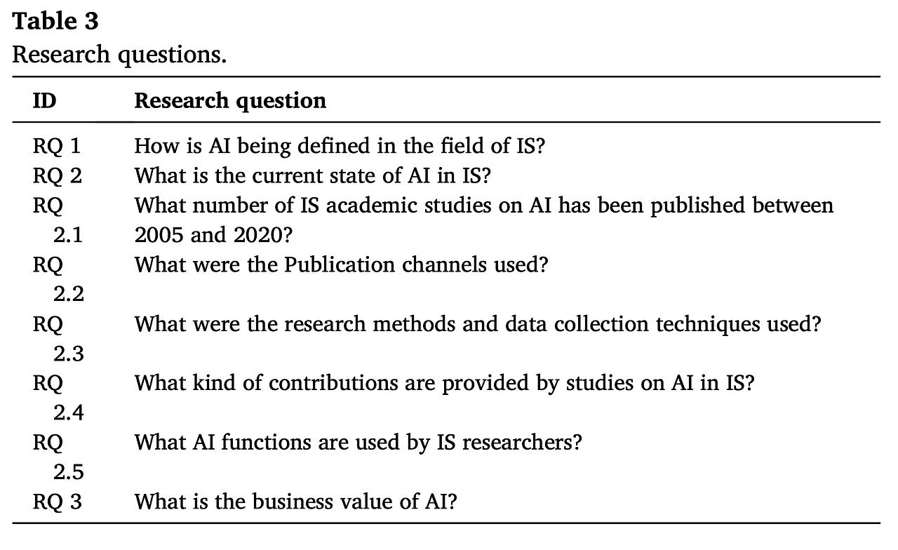 정보 시스템에서 AI에 대한 연구는 여전히 대부분 미개척 상태이다. AI와 관련된 상당한 양의 문헌이 존재함에도 불구하고, IS에서 AI에 대해 알려진 내용을 종합적으로 검토한 연구는 부족하다. 이는 특히 IS에서 AI가 정의되는 방식에 해당하며, 여전히 분산되어 있다.