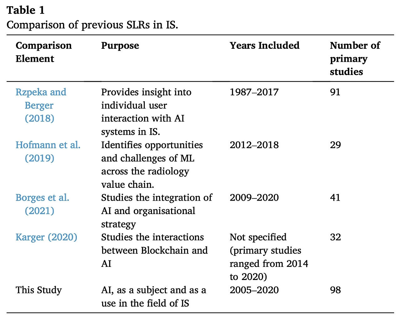 우리는 이 주장을 조사하고 IS 학자들이 수행한 AI 연구의 공백을 식별한다. 우리는 네 가지 이전의 체계적 문헌 검토(SLR)가 수행되었음을 인정한다(Hofmann, Oesterle, Rust, & Urbach, 2019; Rzpeka & Berger, 2018; Borges, Laurindo, Spínola, Gonçalves, & Mattos, 2021; Karger, 2020). 하지만 이 연구들의 한계를 강조한다(표 1 참조).
