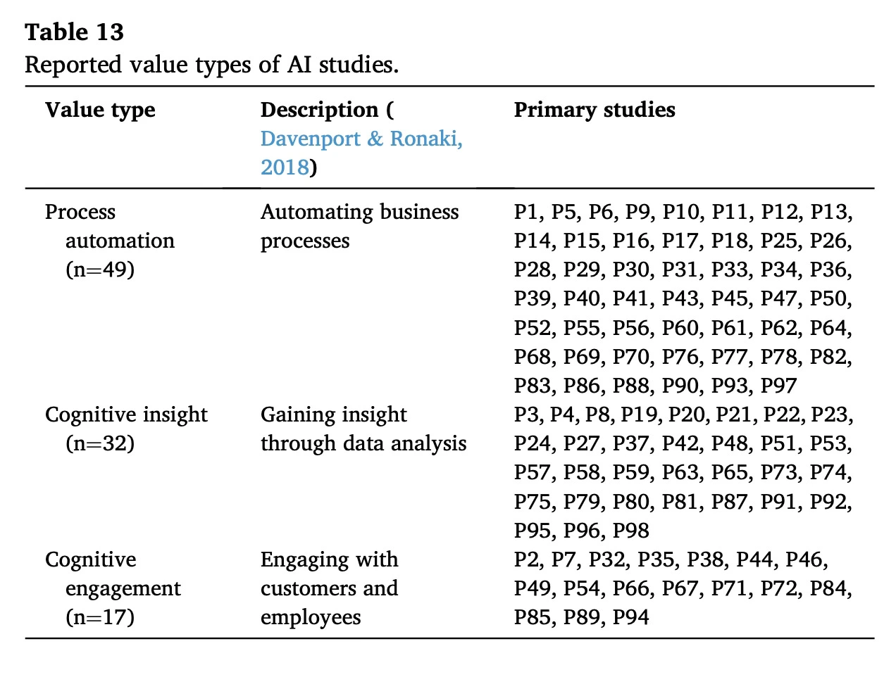 Adding to the above, the different applications of AI largely dictate the type of business value that can be expected. Providing exact definitions on what type of AI application is studied is critical for business value research.