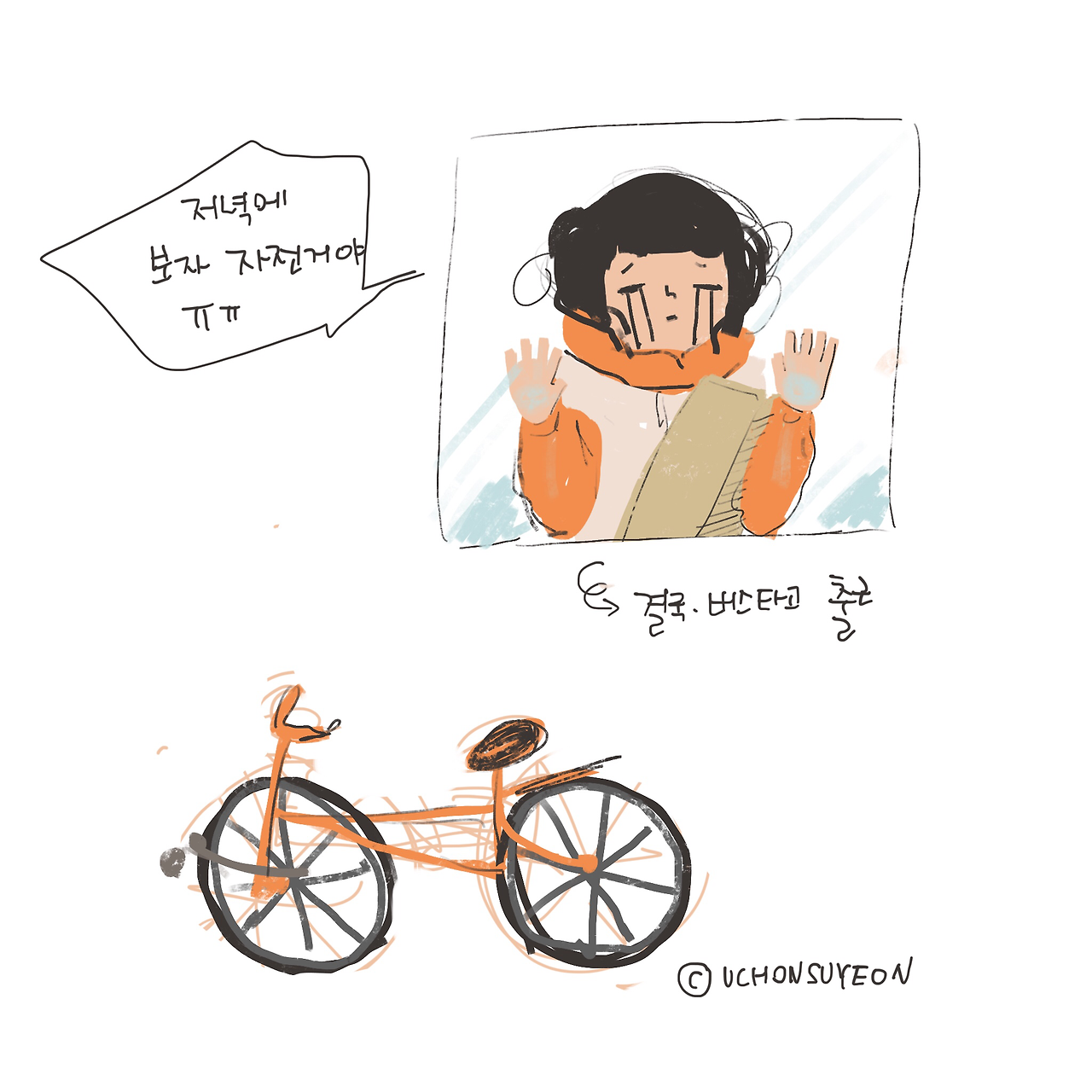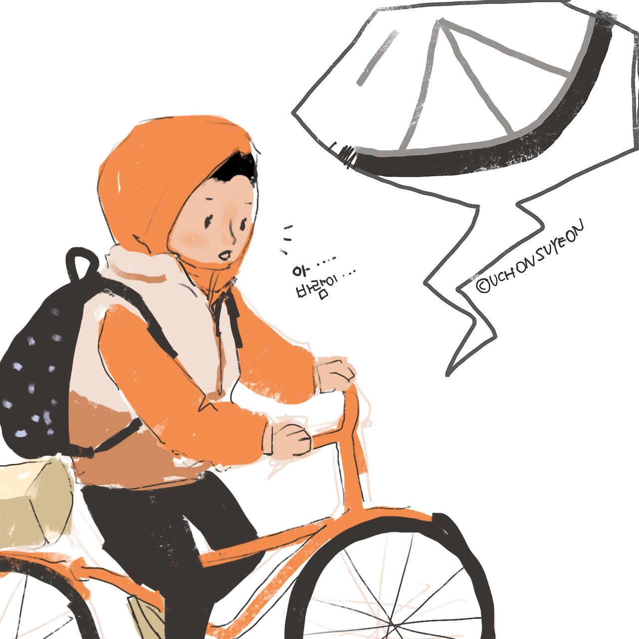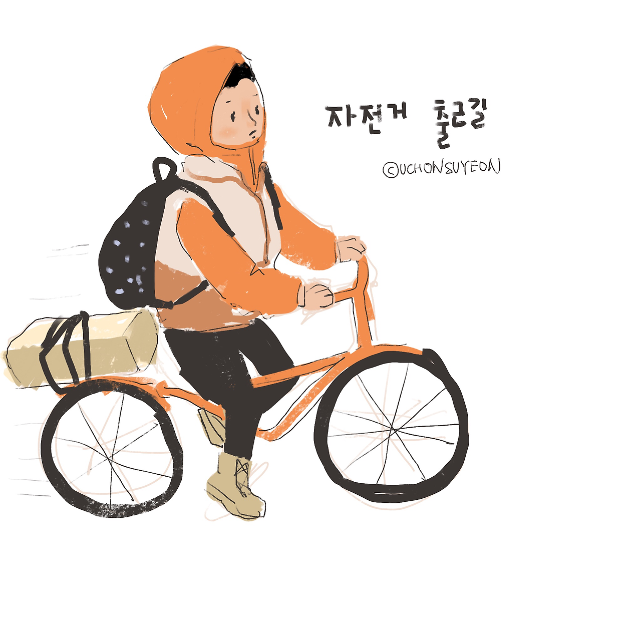 제 자전거는 기분 좋은 오렌지 컬러예요. 제 자전거 복장도 기분 좋음을 넘어서 튀는 오렌지 형광색 후드 자켓이랍니다. 후훗 뒤에는 반송할 택배박스를 하나 싣고 신나게 내달립니다.