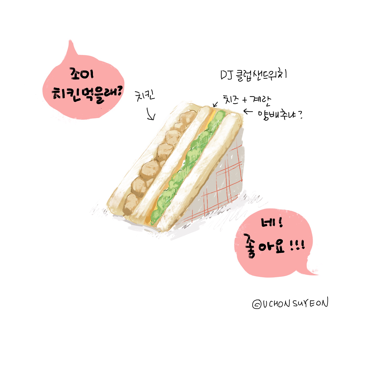 조이가 치킨을 좋아하기 때문에 조이에게 치킨을 먹을 건지 물어보았어요.