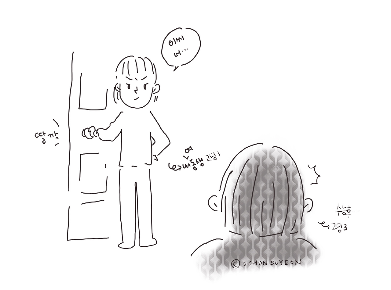 고등학생을 지나니 여동생이 저보다 덩치가 커지더라구요. 하하 그 후로 말로만 싸웠어요. ㅜㅜ 무서운 지지배