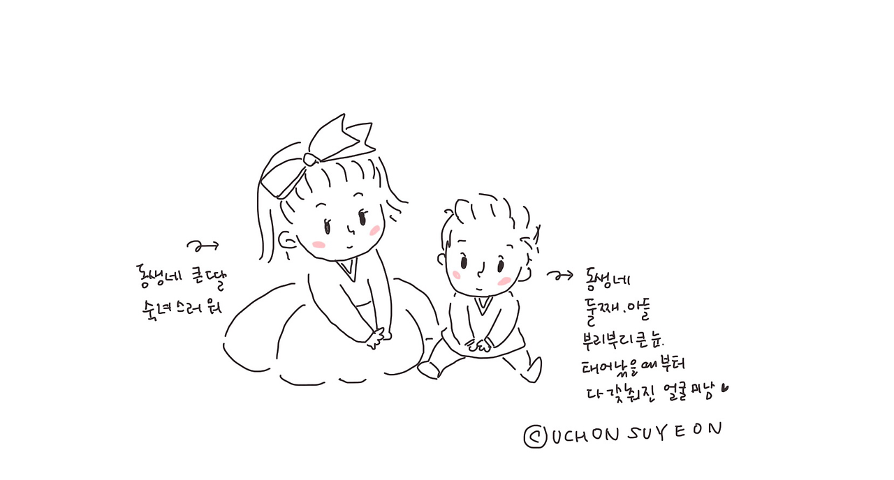 저도 그래요. 둘째를 낳아보니 동생이 어땠을지 짐작되더라구요. 큰아이에게는 둘째가 태어나기 전까지 온전히 사랑을 줄 시간이 있는데, 둘째는 아무래도 태어나면서 부터 쭈우우욱 언니와 사랑을 나누어야하니까 온전히 자신만을 위해 사랑하고 받을 시간이 부족하잖아요. 더군다나 바로 자기 밑으로 귀한 ‘6남매중 막내아들의 막내아들’이 있거든요. 네네 저희 남동생이지요. 생긴것도 귀엽고 예뻐서 (저희 셋중 제일 예뻐요.. 남잔데 예쁘다;;) 그냥 누구에게나 사랑받게 생겼던 사람입니다. (지금은 아저씨 후후 메롱메롱)