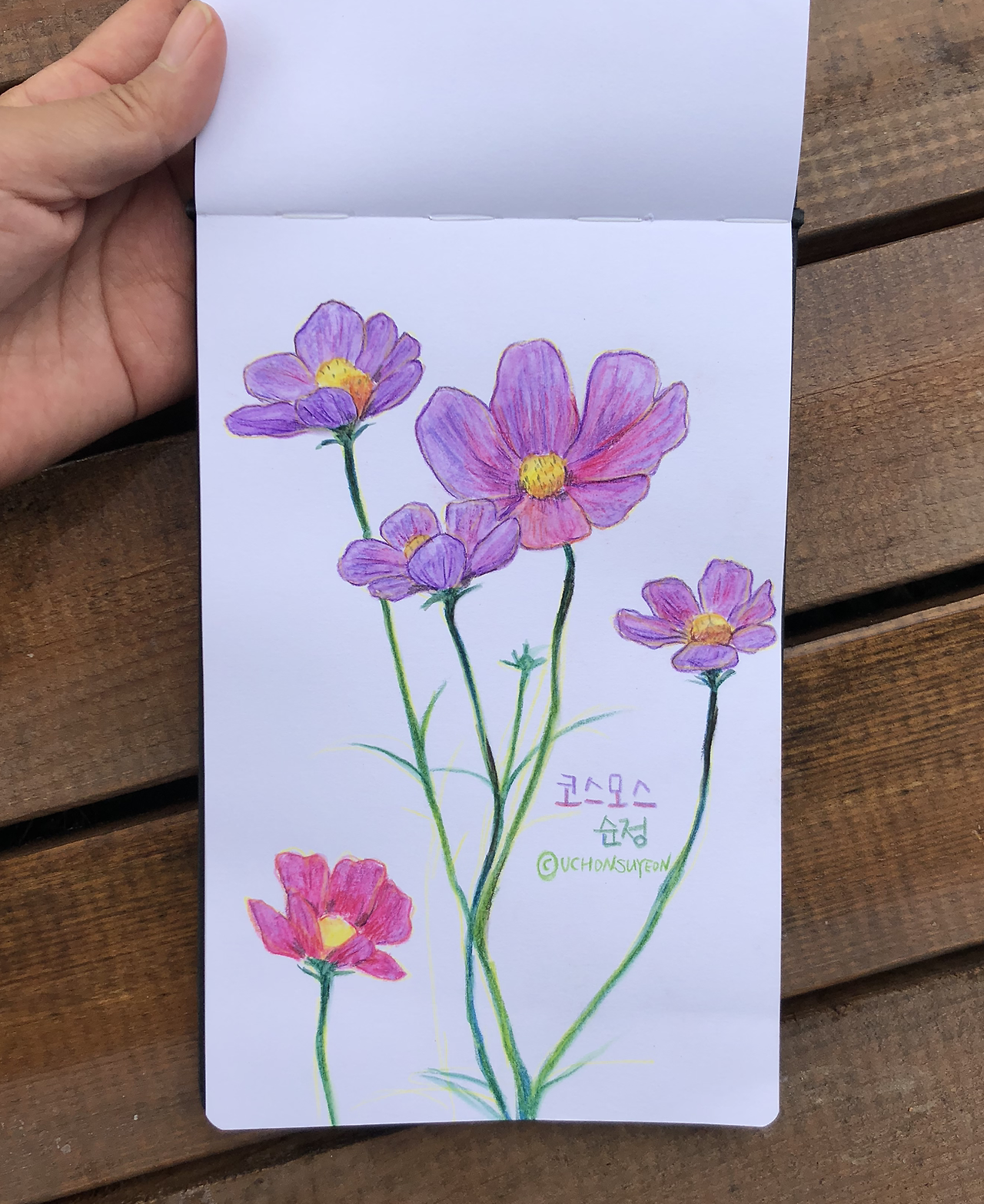 코스모스의 순정~ 이란 노래가사를 알긴 했는데 꽃말 뜻이 순정이였더라구요!! 저만 늦게 알았나요? ㅎㅎ 소녀의 순결이라는 의미도 있던데, 나풀거리는 모양새가 소녀를 닮아서 이런 의미가 생긴 걸까요. 주말농장 여기저기에서는 코스모스가 만개하고 있어요. 예전엔 흔해서 좋아하지 않았는데, 따로 심어놓고 나니 귀애하는 꽃이 되었어요. 아 물론 제 꽃밭에 살아있는 모든 꽃들은 귀애합니다. ㅎㅎ