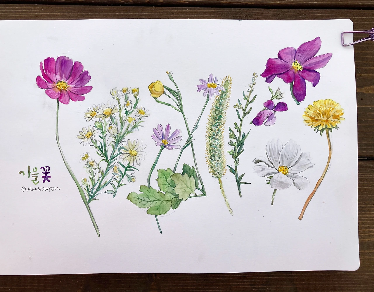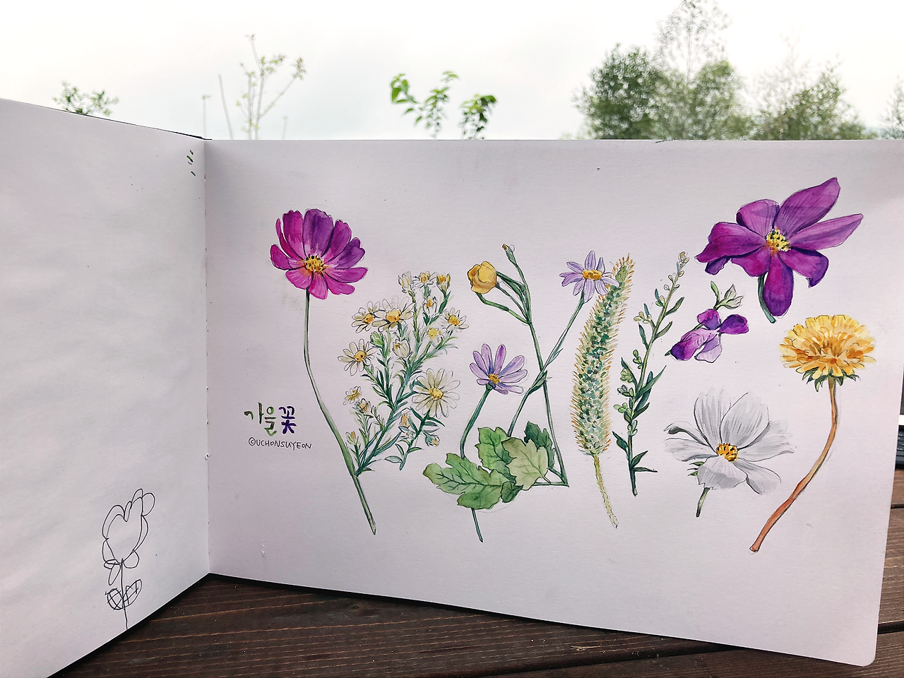 나의 로망, 내가 딴 꽃그리기 으헤헤헤 그리다가 몇번을 중단, 애가 물엎질러, 커피 엎질러, 배고프데, 놀아달래, 똥 쌋데, 졸립데, 그리고 비바람이? 킁.... 이런 역경을 이겨내고 완성했네요!!!