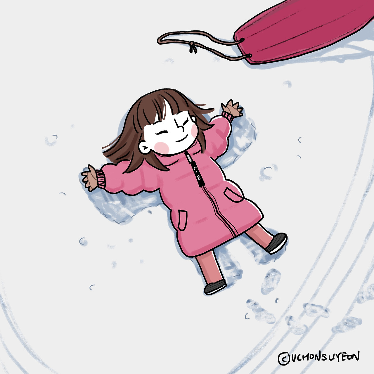 아직 녹지 않은 눈 위로 조이가 누웠어요.