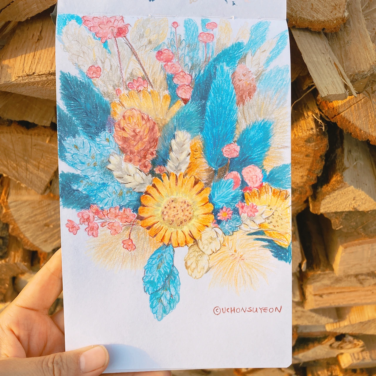 설 연휴 때 시골 대신에 주말농장에 갔어요. 아이들이 마음껏 뛰놀 수 있는 작은 공간이 있어 참 다행이지요. 아이들이 노는 틈에 비닐하우스 구석에서 그림을 그리기 시작했답니다. 한낮의 요즘은 참 따스한데 비닐하우스 안이다 보니 등이 무척 따갑더라고요. 아이들이나 남편도 5분에 한 번씩 불러대는 통에 부서지는 집중력을 겨우겨우 끌어 잡아 완성했네요.