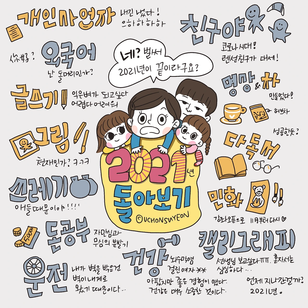 2020년도 힘들긴 매한가지였지만, 2021년엔 무기력증이 살짝궁 찾아왔었어요. 다르게 보면 '놓아보는' 한 해였어요. '언덕 위의 수레처럼'이라는 신조를 갖고 아등바등 살았는데, 딱히 무언가 하지 않고 육아만 해도 되는 것에 적응해 나가는 한 해였지요.