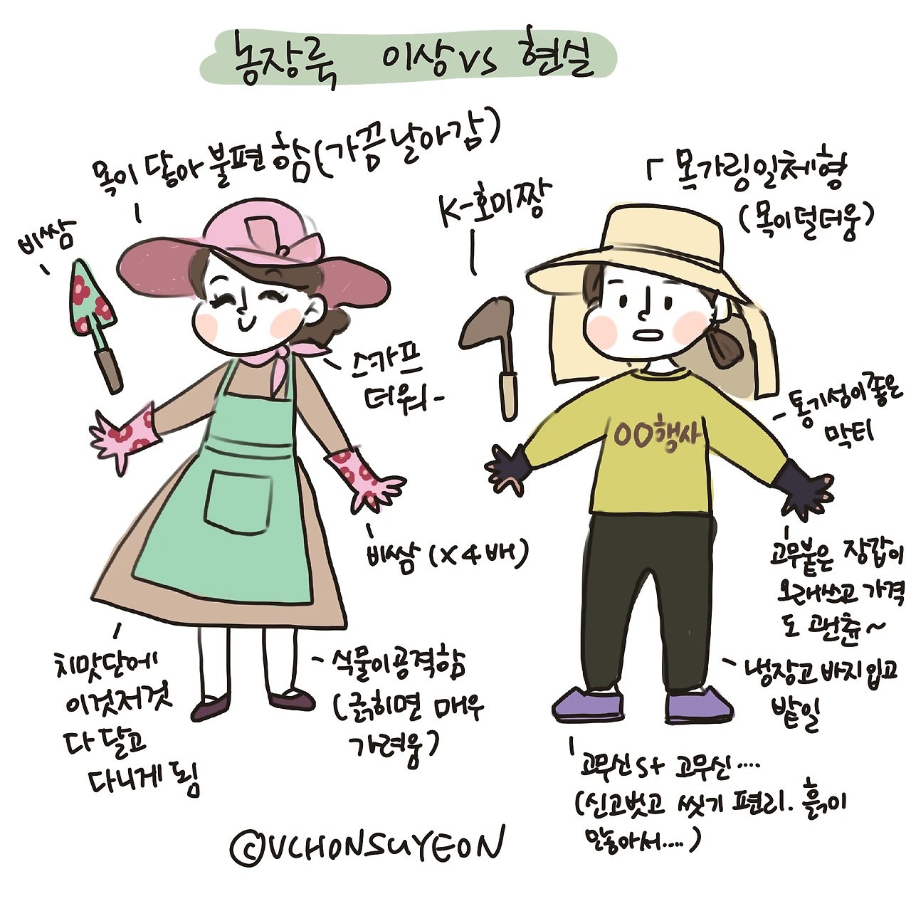 나중에 집을 짓고 텃밭이 안정되고 정원도 정리가 되면 그림의 왼쪽 같은 모습도 꿈꿔보려고요. 실제로 그렇게 아름답게 사시는 분들도 있더라고요. 정말 부지런하고 멋진 분들이에요! 존경스. 요즘에도 밭일 격하게 할 때 아니면 화려한 원피스를 입고 땅을 한 바퀴 돌고 그런답니다. 서울에서 입고 나돌아 다니기 남사스러운 옷도 입고 그래요. ㅎㅎ 코로나로 장롱에 잠들어 있다 여러 이유로 퇴출되는 옷들 생각하니, 차라리 이 옷들 입고 밭일하는 게 낫겠다 싶어서요. 홍홍홍