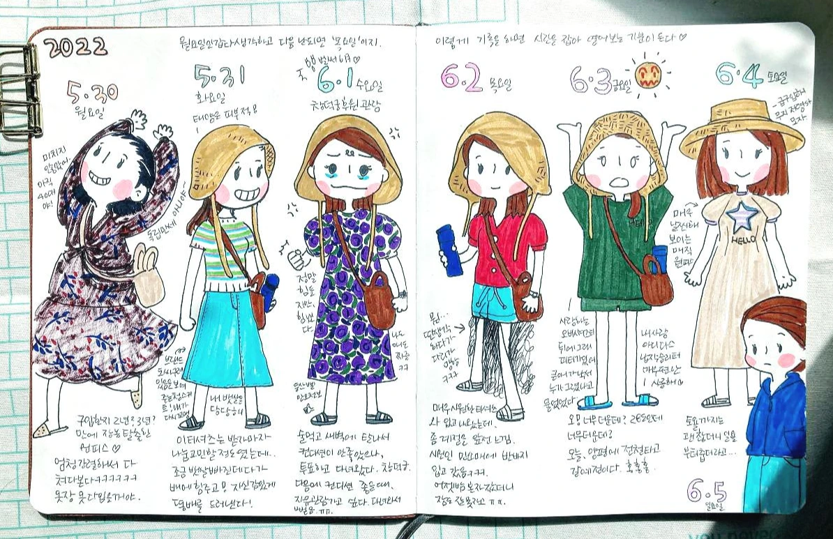 안 쓰는 채색 도구도 많고, 코로나로 집 룩만 입던 습관도 버릴 겸해서 일주일 룩북을 시작했어요. ㅎㅎ 옷 정리할 때마다 일 년을 넘게 안 입은 옷들이 많더라고요. 어울릴까? 고민했던 옷도 똥배 괜찮아? 했던 옷도 과감히 입고 다녀요.