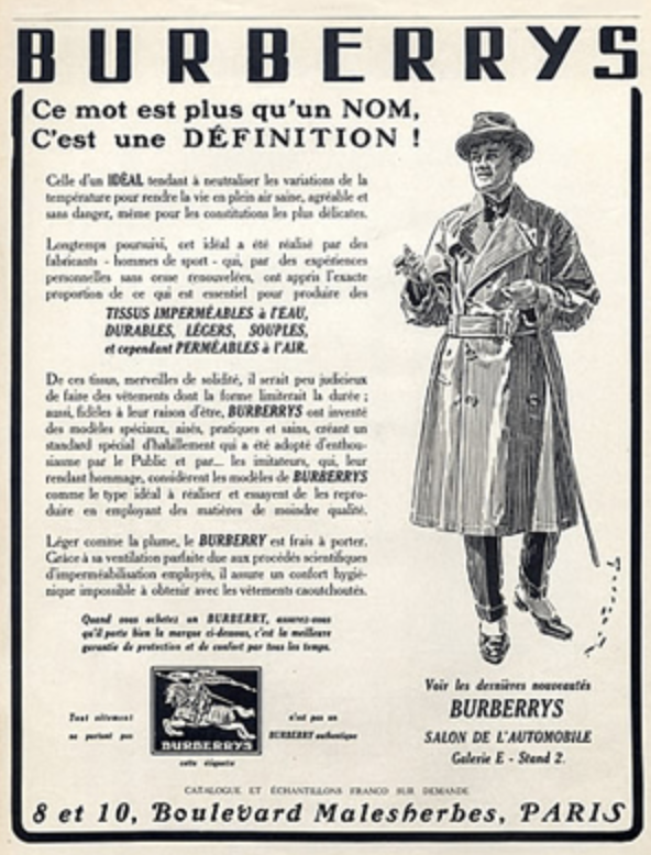 세계 1차 대전이 끝난 후, 연합군은 각자 고향으로 돌아가면서 전리품처럼 트렌치 코트를 가지고 돌아갔다. 이들이 가지고 간 트렌치 코트는 뛰어난 기능성을 갖췄을 뿐만 아니라 디자인 적으로도 훌륭했기에, 사람들은 일상으로 돌아가서도 계속 트렌치 코트를 입거나, 자식들에게 물려주었다. 많은 사람들이 아버지에게 물려받은 버버리 트렌치 코트를 입다보니 자연스레 버버리는 대를 이어 물려 입는 좋은 옷이라는 이미지까지 가지게 되었다. 세계 2차대전이 일어난 1940년대에는 2차 대전을 승리로 이끈 처칠이 버버리를 즐겨입는 모습을 보여, 지적인, 상류층이 즐겨입는 브랜드라는 이미지까지 심어준다. (처칠은 낙제생 이미지가 있지 않나요? 어째서 지적인 이미지가 여기서 파생될 수 있죠?라고 묻는다면, 물론 학창 시절 처칠이 낙제생이었다는 이야기가 유명하긴 하다. 하지만 처칠은 영문학 과목은 매우 뛰어난 성적을 보였으며, 처칠의 연설문을 보면 그가 얼마나 타고난 달변가인지 알 수 있다. 게다가 그는 1953년 헤밍웨이를 제치고 노벨 문학상을 받을 만큼 글을 잘썼다. 물론 헤밍웨이는 그 다음해에 노벨 문학상을 수상하긴 했지만, 헤밍웨이는 처칠의 노벨 문학상 수상은 영국의 압박에 의한 것이라며 항의했지만, 처칠이 쓴 2차 대전 회고록은 사실적이면서도 유려한 문체로 많은 사람에게 인정받은 작품이었다. 학교에서는 낙제생이었을지 몰라도, 사회로 나온 처칠은 지금까지 명연설로 회자되는 명연설가였고, 수 많은 명언을 제조한 명언제조기였다. 영국인들이 존경하는 인물 1위로 손꼽히는 처칠이 버버리를 즐겨입었다는 것만으로도 버버리 코트 이미지가 꽤나 근사하게 느껴지지 않는가? 아님 말고...)
