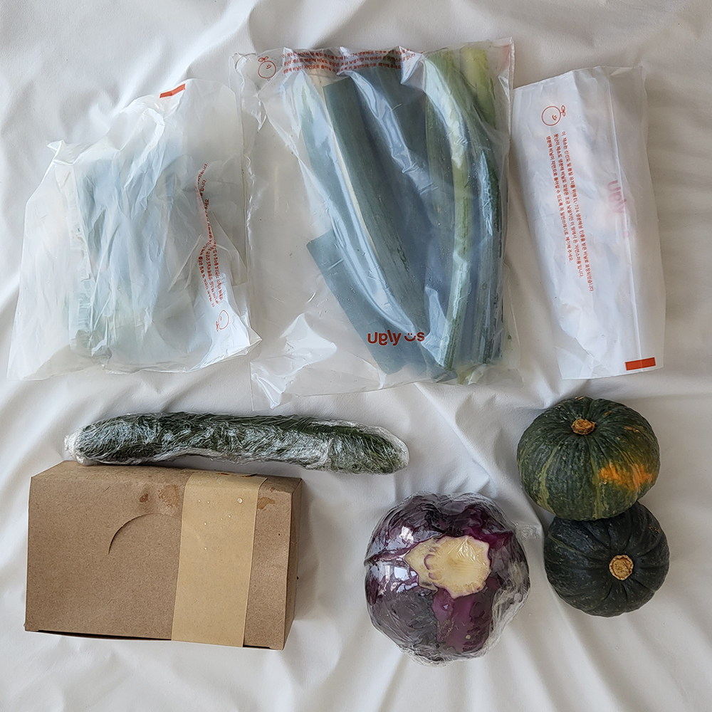 어글리어스의 경우에는, 잎채류나 겉부분이 손상이 쉬운 과채류, 버섯류는 생분해 비닐을 사용하고, 방울토마토같이 흩어지기 쉬운 채소는 종이 박스에 담겨 배송되었어요. 그 외에 비교적 단단한 오이나 양배추류에는 겉 껍질 보호를 위한 생분해 랩이 사용되고 있고요.