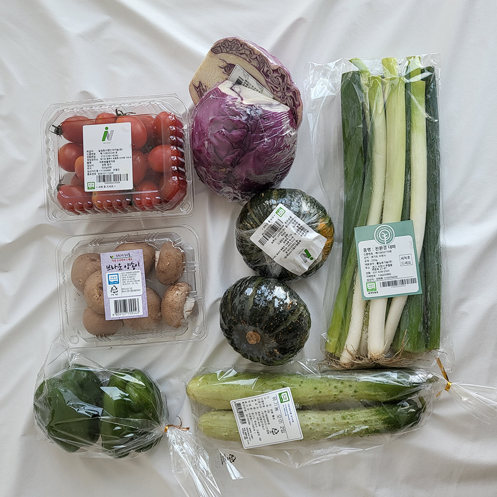 미니단호박 2개, 적양배추 1/2통 *2개, 백오이 2개, 대파 250g, 피망 2개, 방울토마토 500g, 브라운 양송이 150g