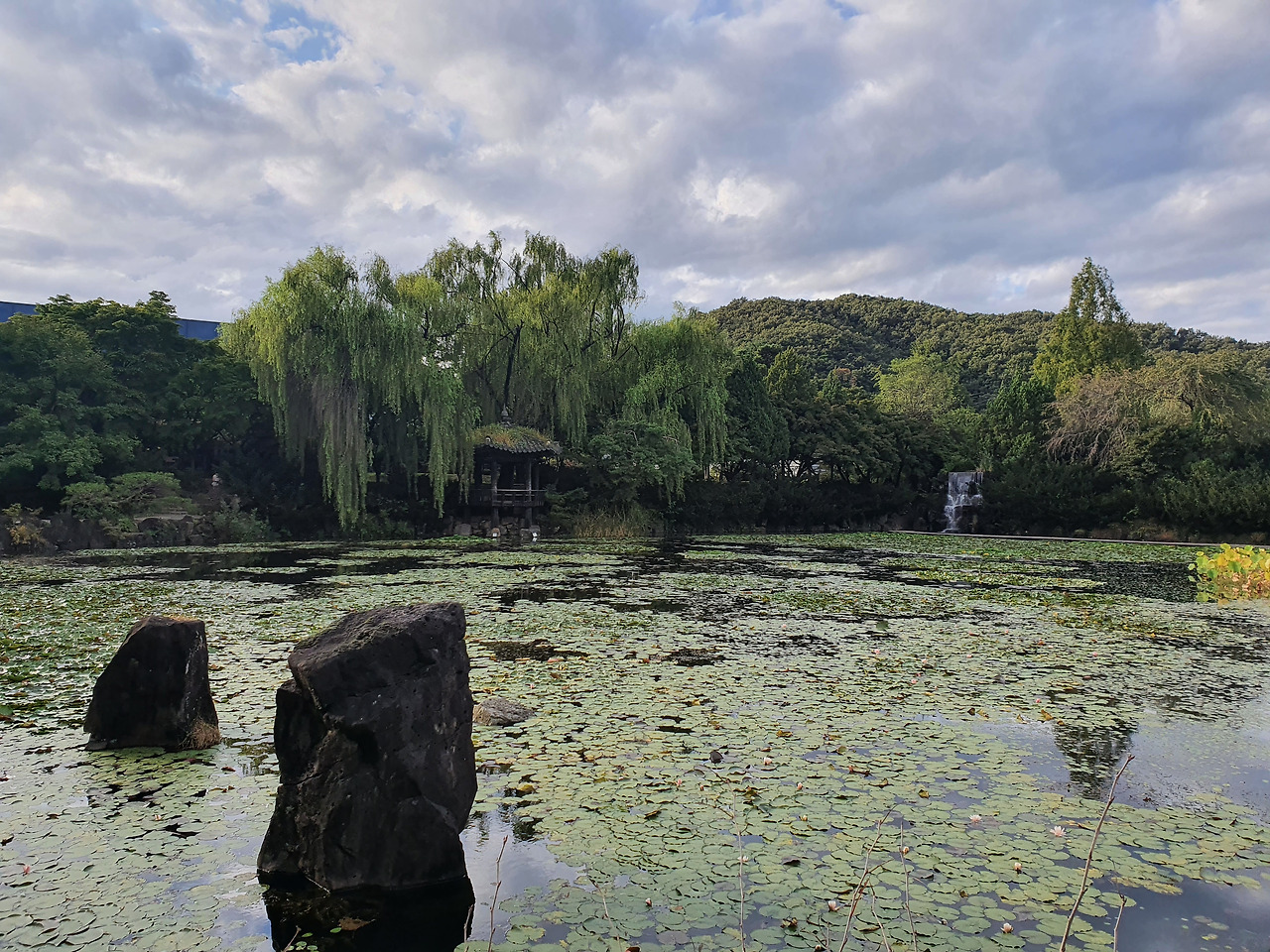 이번에 가 볼 장소는 여기 수목원이 시작된 장소인 벽초지 호수를 따라 산책길이 이어지고 동양풍의 정자와 물레방앗간이 있는 감동의 공간이다. 서양에서 동양으로 걸음 한 번으로 이동할 수 있다. 개인적으로는 신화의 공간보다 여기가 훨씬 나았다. 길가에는 버들나무가 흩날리고 있고, 호수에는 수련이 아름답게 자라 마치 모네의 지베르니 정원의 동양판이 이렇구나 느낄 정도였다. 걷는 걸음마다 또 풍경은 다양한 경관을 연출해서 눈을 감을 새가 없었고, 카메라의 셔터는 멈출기미가 보이지 않았다.