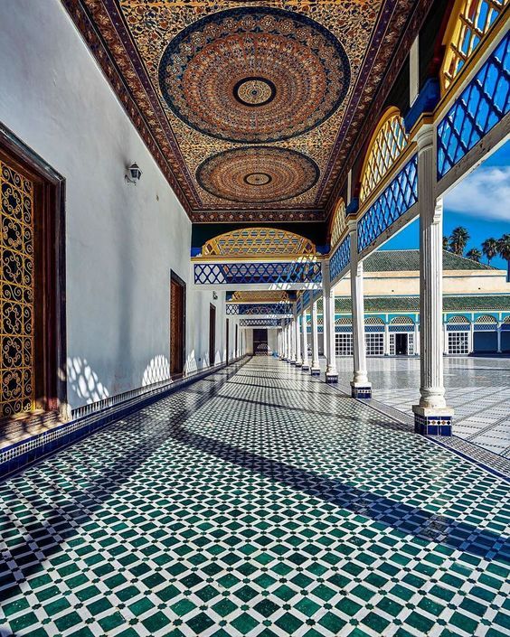 바히아 궁전은 아름다운 궁전이라는 뜻의 아랍어다. 19세기 모로코의 최고의 궁전이었다고 한다. 흑인 노예 출신 시무사가 권력을 잡고 술탄의 지위에 오르면서 지어졌다. 그는 궁을 크게 확장 공사를 하고, 4명의 아내와 24명의 첩을 거느리며 호화롭게 살았다. 바히아라는 이름은 그중 가장 좋아했던 아내의 이름을 따서 지은 것이라고 한다. 얼마나 화려하게 잘 지어졌나 내부가 궁금했지만, 가는 날이 장날이다. 우리가 간 날에 궁에 행사가 있어서 관광객에게 오픈이 되지 않았다. 밖에서 봤을 땐 건물이 평범한 편이었는데, 이것 또한 아랍식 건축의 특징이라고 한다. 겉에는 창문 하나 만들지 않은 폐쇄형 구조. 대신 내부를 아주 화려하게 만든다. 그래서 공기 순환을 위해 건물 가운데 중정을 만드는 것이라고 한다. 그러고 보니 마라케시에서 본 건물들은 대부분 적벽돌 색 허름한 건물들이었는데 내부는 화려하고 멋진 타일 장식과 중정으로 꾸며진 곳이 많았다.