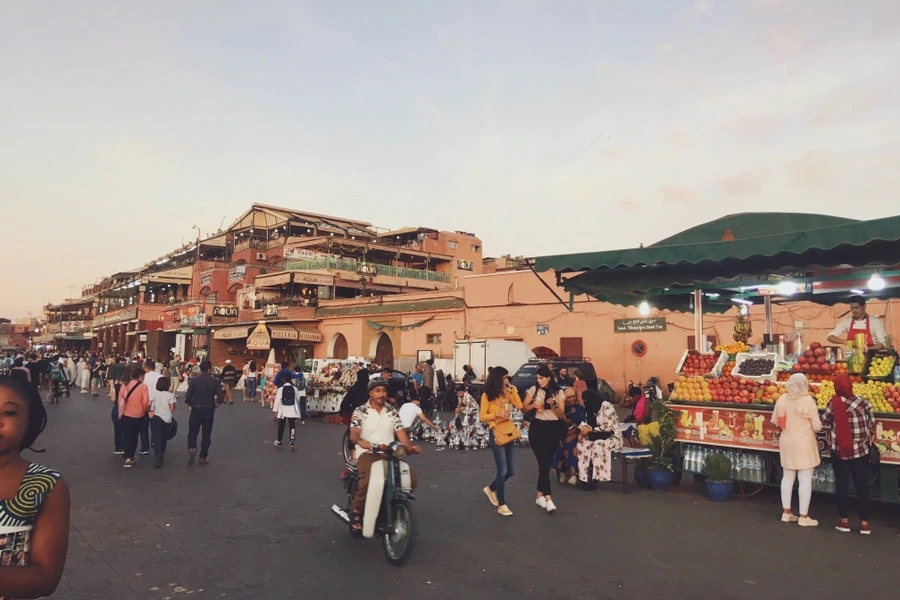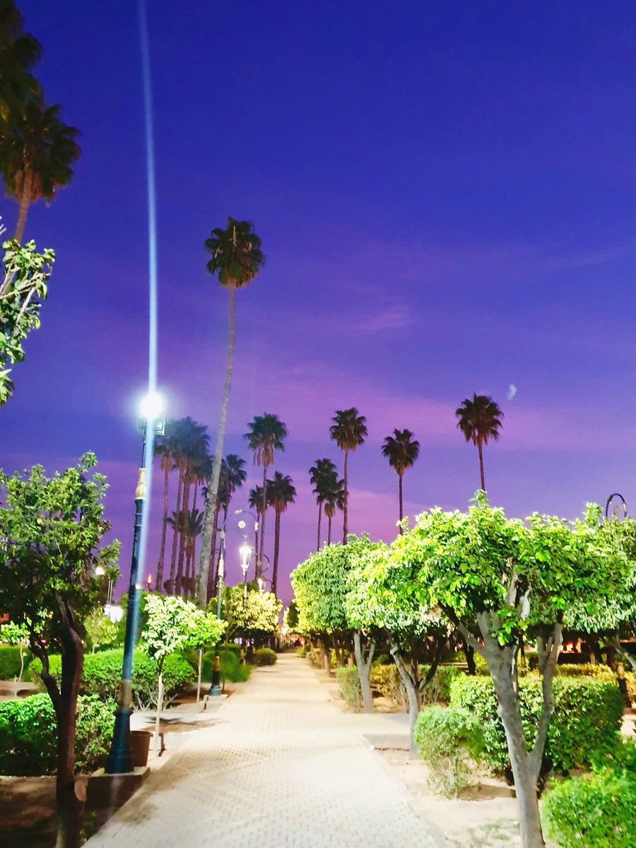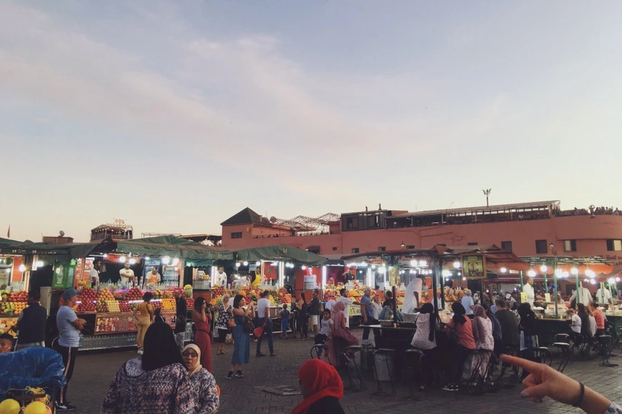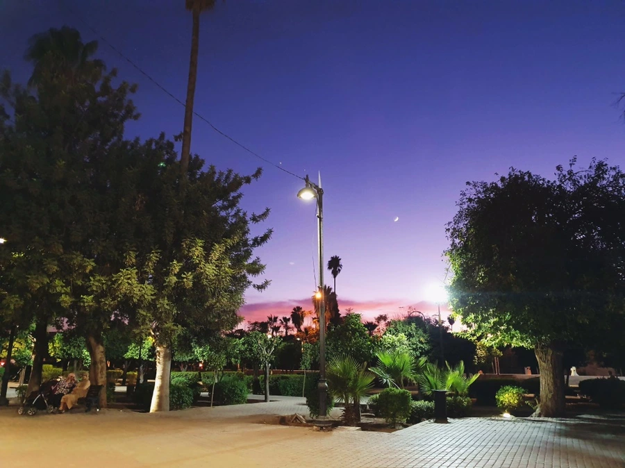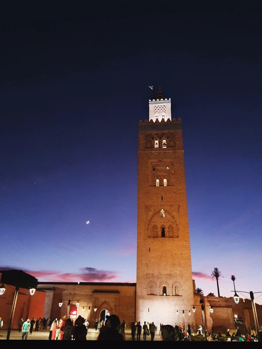 하늘이 오렌지빛으로 물들기 시작하더니 이내 보랏빛으로 물들었다. 마라케시는 붉게 물든 도시라는 닉네임을 가지고 있다. 처음엔 건물들이 붉은 벽돌색이어서 그런가 생각했는데, 아마 하늘이 붉게 물들어서 가진 별명이 아닐까 하는 생각도 들었다. 멋진 노을을 총 4박 5일을 있었던 마라케시에서 매일 볼 수 있었다. 모스크 뒤쪽으로 펼쳐진 멋진 노을에 저절로 발길이 이끌였다. 보랏빛 하늘과 초승달. 하늘이 이렇게 예뻐도 되나 싶게 예쁘다. 무슨 말이 더 필요 한가. 하루를 꽉 채워 보낸 후의 저녁시간, 지칠 법도 한데 레드불이라도 마신 듯 우린 이 예쁜 하늘 기운에 에너지가 솟았다. 마라케시의 밤을 맘껏 즐겼다. 이 도시 너무 매력적이다. 한 도시에 이렇게 여러 가지 면을 가지고 있으니 사랑하지 않을 수 없다. 어제와 전혀 다른 오늘 그리고 또 다를 것만 같은 내일. 이 도시는 나에게 긴장감을 놓을 수 없게 만드는 단짠단짠 한 그런 마력이 있다.