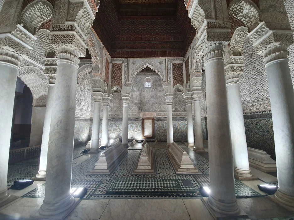 몇 번 길을 헤매고 물어가며 도착한 사디안의 묘. 입구가 좁아서 살짝 찾기가 어려웠다. 좁은 입구를 돌아 들어가면 묘지라고 하기에 화려하고 아름다운 장소가 나온다. 이탈리아에서 수입한 화려한 대리석과 금으로 장식했다고 한다. 왜 무덤이 관광명소가 되었을까? 16~17세기 100여 년 동안 모로코를 통치했던 사디 왕조가 알라위 왕조에 의해 무너 졌다. 이후, 왕권을 잡은 알라위 왕조의 술탄 물레이 이스마엘이 사디 왕조의 업적들을 모두 파괴하길 원한다. 종교적인 이유로 유일하게 파괴하지 않은 것이 바로 그들의 무덤이었다. 파괴 대신 묘 입구에 높은 벽을 세워 봉쇄했고 이곳은 20세기 초 발견되기 전까지 약 200여 년간 베일에 싸여 있게 되었다. 사디 왕조의 왕가 무덤으로 약 66여 명의 시신이 묻혀 있다. 야외 정원에 있는 무덤들은 상대적으로 직위가 낮은 고위 군인이나 왕가의 하인들의 무덤들이다. 직위가 높은 분들의 무덤은 실내에 안치되어 있다. 아래 사진이 바로 이곳의 가장 중요한 장소로 12개의 기둥 홀이다. 사디 왕조의 주요 왕과 왕자들의 관이 안치되어 있다. 순백의 대리석으로 확실히 다른 곳들보다 고급스러운 느낌이다. 이곳은 작은 통로를 통해서만 들어갈 수 있다. 이곳을 보기 위해 기다리는 사람들로 꽤 오랜 시간 줄을 서 기다린 후 볼 수 있었다.