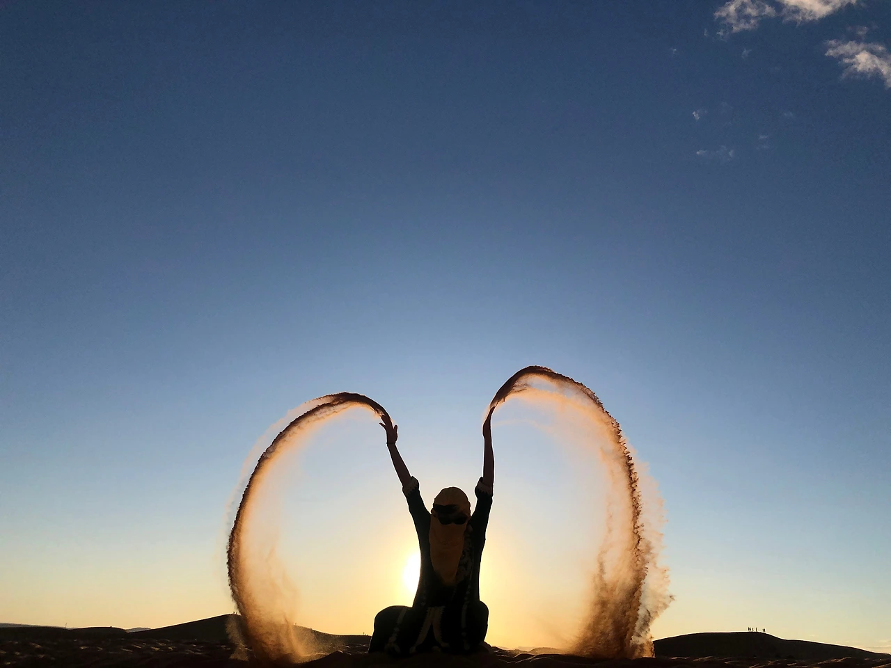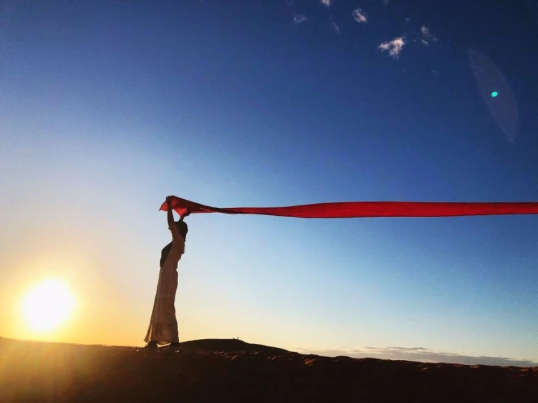멀리 사람들이 보인다. 사막에서 다른 무리의 사람들을 만났다. 바로 여기는 알리네 포토 스폿이다. 오전에 떠난 조 사람들과 하루 전 떠난 사람들 그리고 투어를 막 시작한 우리 이렇게 3팀이 만나게 되는 장소이다. 그리고 우리를 기다리고 있는 스파르타식 포토 그래퍼이자 가이드 사이드가 있었다. 그는 사진을 잘 찍는다. 해가 지기 전에 모두에게 인생 샷을 남겨 주려니 마음이 바쁘다. 덕분에 사막에서 멋진 인생 사진을 얻을 수 있었다. 사실 사막에서 2박을 고민할 때 할 게 없어서 심심하면 어떡할까 고민을 했었다. 그래서 책도 한 권 챙겼다. 그러나 사막에서의 2박은 세상 바쁜 일정이었다. 열정 포토그래퍼의 지휘 아래 인생 샷을 남기느라 바쁜 틈을 타 어느새 노을이 지고 있다. 우린 잠시 멈춰 모두 같은 곳을 바라보았다. 사막에서의 노을. 아름답다. 참 값진 순간이다. 세상의 가장 아름다운 것들은 공평히 모두에게 나눠진다고 했다. 모든 이에게 무료로 공평하게... 그 아름다움을 더 아름답게 보기 위해서는 육체적 노력이 더 해져야 한다고 했다. 이 순간 그 책에서 봤던 문장의 의미가 떠올랐다. 그래서 내가 여기에 왔구나.