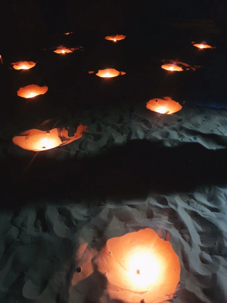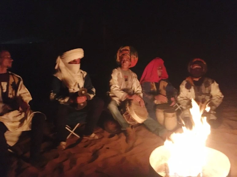 베이스캠프에 도착했다. 서프라이즈! 캠프장을 들어서자마자 모두 감탄사가 나온다. 바닥에 홀을 파서 초를 넣어 로맨틱하게 입구를 장식해 두었다. 그리고 상상 이상으로 좋았던 사막 숙소 컨디션에 감동했다. 아, 내 기대치가 사실 엄청 낮았던 것 같다. 바람 겨우 막아주는 텐트나 천막 침낭 속에서 잘 수도 있겠다. 정도를 상상했었다. 여행 전 너무 바쁘기도 했었고 잠자리에 대한 후기를 거의 못 찾아보고 간 사막이었다. 숙소는 돔 형태의 꽤 크고 튼튼해 보이는 천막으로 만들어져 내부에는 침대가 놓여 있다. 그리고 심지어 수세식 화장실이 있다. 물이 부족해 아껴 써야 하긴 하기만 작은 세면대도 갖추고 있었다. 식당 공간도 따로 마련되어 있다. 가끔 최악의 상상이 도움이 될 때가 있다. 상상 덕분에 이 정도의 환경은 지금 내게 최상급 사막 호텔이다. 방을 배정받고 푸짐하게 차려주는 모로코식 저녁 식사를 함께 하고 나면 캠프 밖 한편에 모닥불을 피워 준다. 옹기종기 불 곁에 둘러앉으면 가이드들이 아프리칸 노래와 악기로 파티를 만들어 준다. 영혼을 불 사르는 연주와 노래다. 같이 원을 만들고 아프리칸 춤을 배워보며 우리의 사막의 밤을 축하한다. 어둠 속의 사막, 모닥불, 음악 우린 잠시 동심의 세계로 돌아간 듯 허물없이 친해졌으며 함께 그 시간을 즐겼다. 파티가 끝나면 낮에 그 프로 사진기사 가이드님이 별 인생 사진도 찍어주고 누워서 별을 볼 수 있도록 매트도 깔아준다. 매트에 누워 하늘을 바라보며 이대로 별들과 함께 잠이 들어도 참 좋겠다고 잠시 생각했다. 그때만 해도 사막의 새벽 추위를 알지 못하고 말이다.