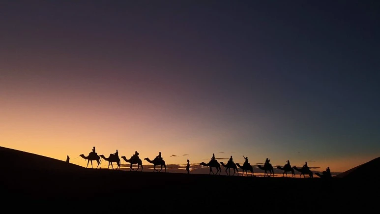 잠시 쉬는 타임이 끝나고 다시 길을 떠난다. 버스에서 낙타로 바뀐 어제의 반복인 듯도 하다. 낙타는 사막에서 잘 걸을 수 있는 노하우와 신체 구조를 가지고 있다고 한다. 그런데 사람이 걷기에는 보통 힘듦이 아니다. 사막 모래에서는 잠시만 걸어도 힘이 많이 빠진다. 모하는 우리와 낙타들을 이끌며 사막을 묵묵히 걸었다. 중간중간 지루하지 않게 농담도 잊지 않았다. 이 지역에 사는 사람들을 베르베르 민족이라고 하는데 모로코 사람과 다른 소수 유목 민족이다. 언어도 다르다. 생김새도 다르고 성격도 다른 게 느껴졌다. 이 민족을 용맹하고 사나운 성격이라고 설명해 놓은 글을 본 적이 있다. 그런데 내가 만난 여기 사람들은 세상의 나쁨은 보지 않고 살아온 듯한 순수함이 있는 사람들이었다. 순수한 낙타와 사람들도 닮아 있다. 주어진 삶에 감사하며 묵묵히 살아가는 느낌이다. 적어도 우리가 만났던 사람들은 그러해 보였다. 어느새 사막 한가운데에 왔다. 주변은 모래와 우리뿐이다.