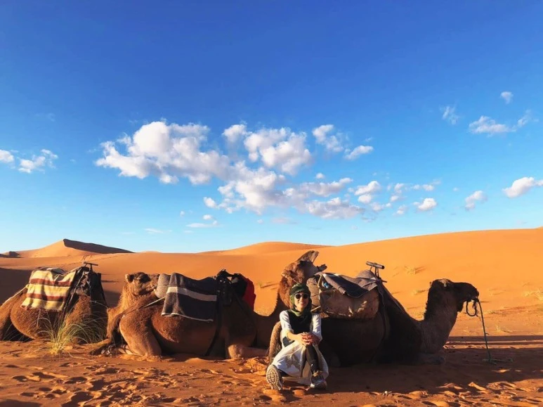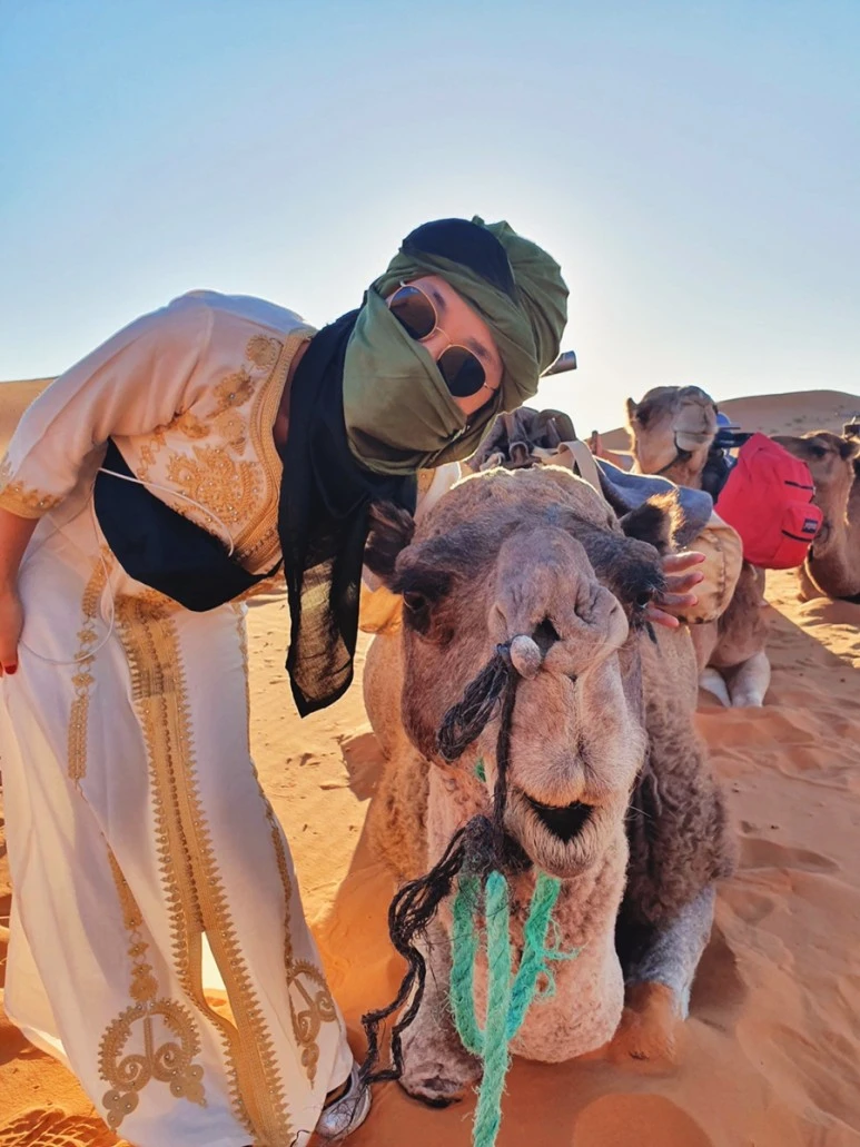 우리는 낙타를 배정받고 사막 길을 걷기 시작했다. 나의 첫 낙타 밥. 밥은 우리 조의 리더이다. 가장 오랜 경력이 있는 낙타가 선두에 서고 그 사이에 어린 낙타를 그리고 뒤쪽에 중간 정도 경력이 있는 낙타를 배치해서 밸런스를 맞춘다. 리더답게 듬직했던 밥. 낙타를 가까이에서 본건 처음이었다. 순수하고 착한 눈망울과 참 순한 성격이다. 평생을 사막을 걸으면서 사는 낙타. 뭔가 짠하고 미안한 마음과 동시에 묵묵히 주어진일을 하며 사는 낙타의 삶에 대해서도 한번 생각해 보게 되었다. 그리고 우리를 사막에서 편안하게 이동하게 해 주어서 감사하다. 사막으로 들어서 한참 걷다가 잠시 쉬어 간다. 밥과 사진도 같이 찍고 친해지는 시간. 우리의 가이드 모하가 낙타 다루는 법과 사진 잘 나오는 노하우도 알려준다. 그리고 나와 내 친구에게 모로코식 이름을 지어 주었다. 나는 아이샤 친구는 사라 그 후 모하는 우리를 아이샤와 사라라고 불렀다.
