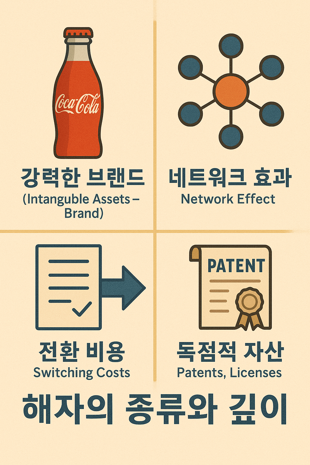경제적 해자는 다양한 형태로 존재합니다. 대표적인 유형들은 다음과 같습니다.