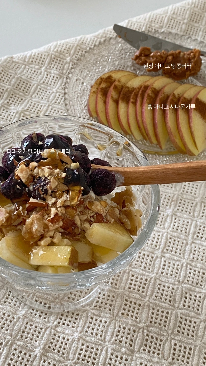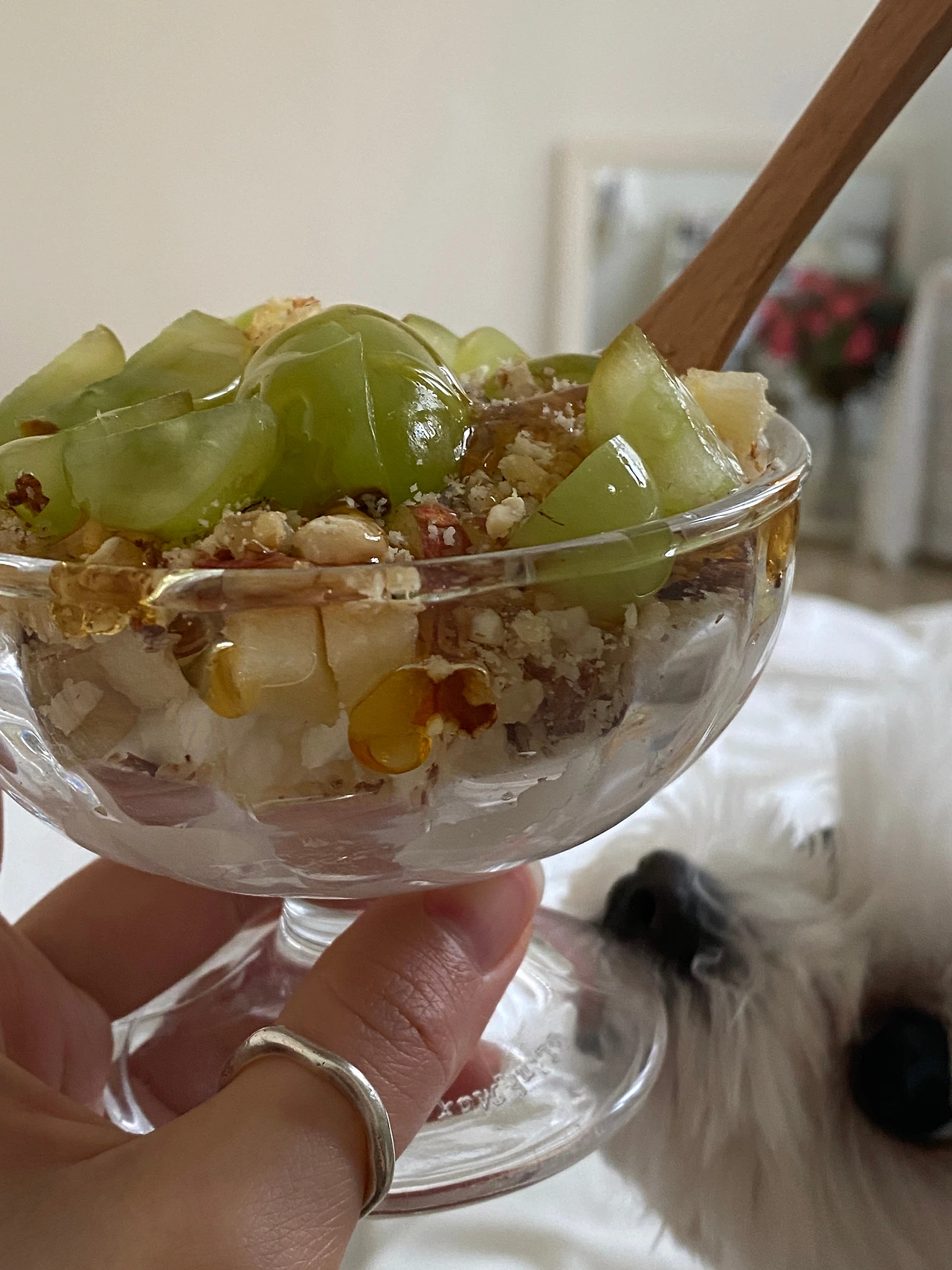 다음 날 아침, 드디어 식량이 생겼다. 그릭요거트를 크게 한 스푼 떠서 덜어두고 아몬드를 열심히 빻아준다. 개인적으로 아몬드는 가루처럼 빻을수록 맛이 좋았다. 토핑은 청포도, 사과, 블루베리 뭐든 상관없다. (귤은 별로였다) 중요한 건 꿀을 듬뿍 뿌려줘야 한다. 한 입 먹으면 너무 꾸덕꾸덕해서 입안에 과일, 꿀, 요거트가 옹기종기 모인다. 꿀이 묻지 않은 부분도 먹어본다. 고소한 맛은 신기하다. 들기름의 고소함, 고소한 원두커피. 이 그릭요거트는 깔끔하게 고소해서 토핑과 잘 어우러졌다. 유리로 된 디저트 볼에 세워진 그릭요거트 산은 아름답다. 꿀을 뿌려 윤기가 더해져 유리알처럼 반짝였다. 보석을 한 숟갈 씩 캐내 떠먹는 느낌이다. 덕분에 귀한 아침이다.