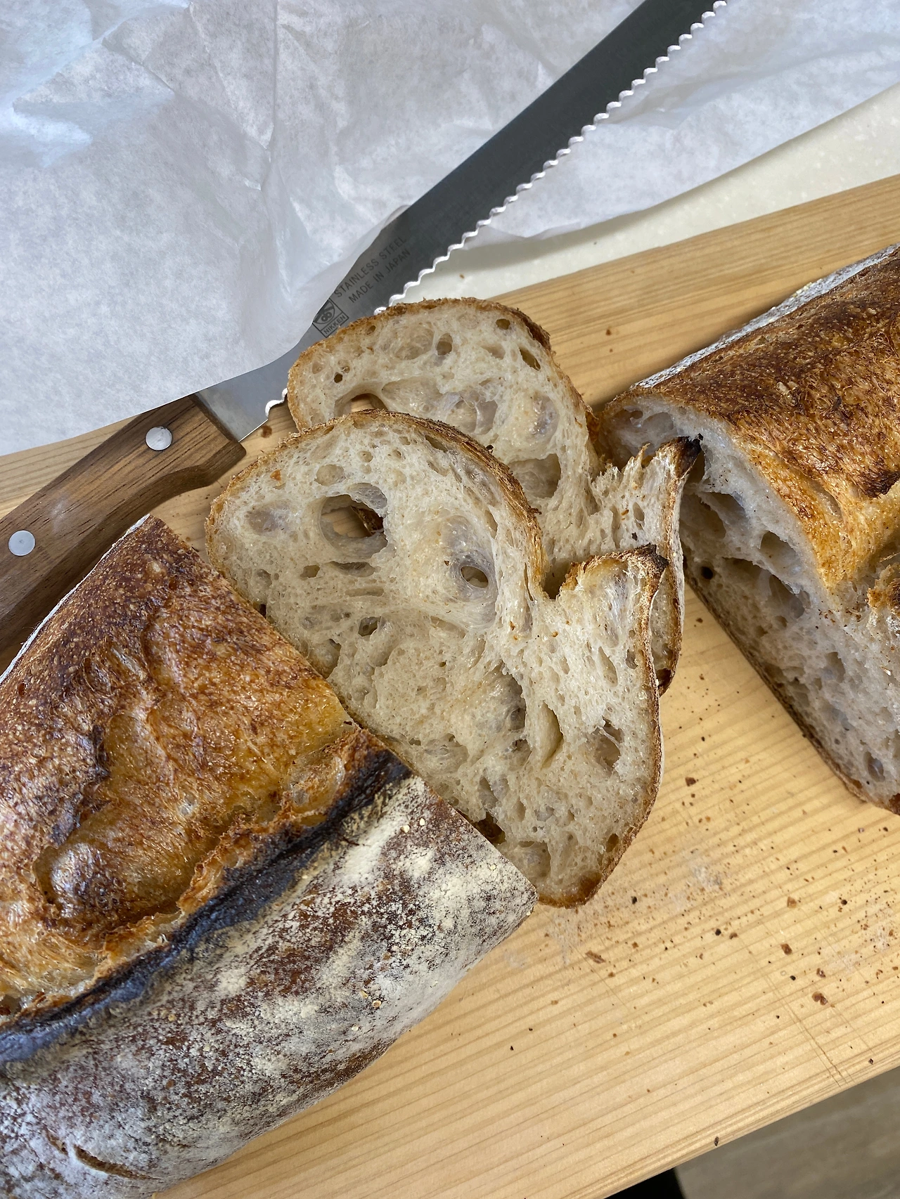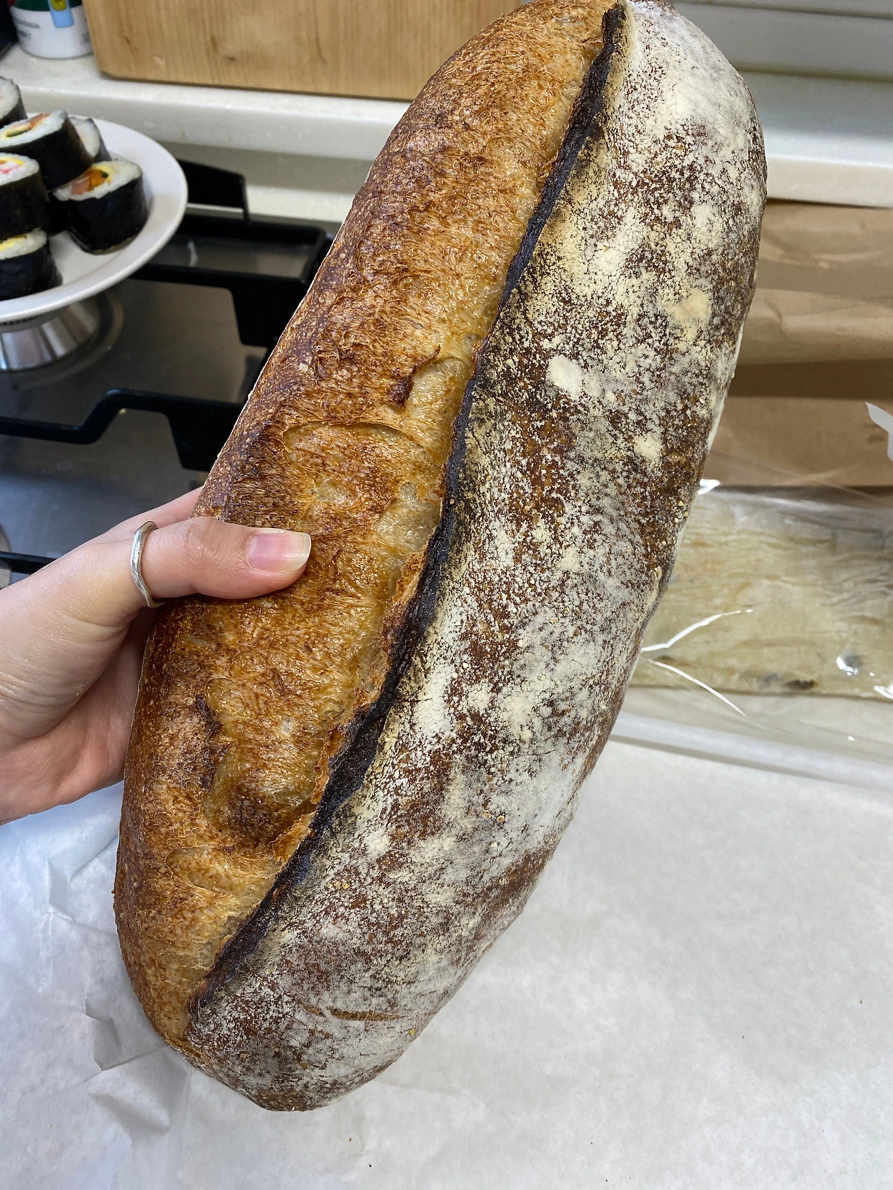 맛의 공식을 기억하자. 초록, 하양, 빨강. 이탈리아 국기 색을 떠올리면 된다. 바질, 치즈, 토마토. 무조건 맛있는 조합이다. 파스타를 만들어 먹어도 좋지만, 자칭 ‘샌드위치 러버’는 오픈 샌드위치 레시피를 택했다. 빵은 잘 구운 치아바타 대신, 바삭 쫄깃한 깜빠뉴에 먹는 걸 좋아한다. 운 좋게도 집 근처 유명한 천연 발효종 빵집이 있어서 종종 빵 쇼핑을 나선다. 바게트, 깜빠뉴, 호밀빵 등등 담백하고 시큼한 사워도우의 맛이 난다. 디저트로 먹을 수 있는 빵도 과하지 않고 깔끔하다. 욕심부리지 않고 내 머리통만 한 깜빠뉴를 구매했다. 냉동실에 보관하면 빵 생김새만큼이나 몇 주는 든든하다.