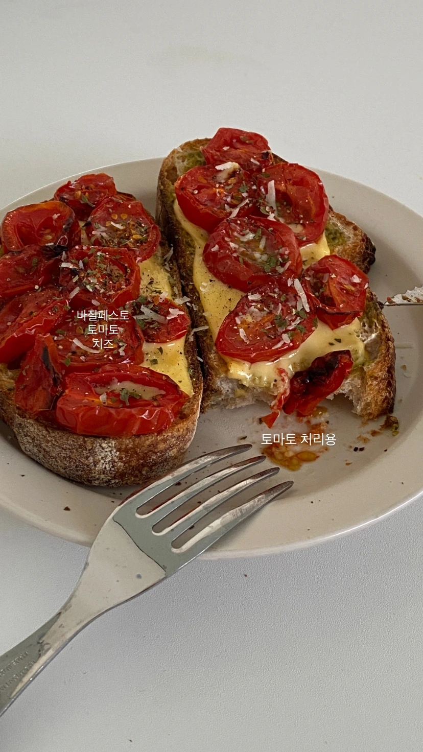 방울토마토는 생으로 먹기보다 요리에 활용하려 구매하는 편이다. 토마토 카레나 토달볶(토마토 달걀 볶음) 같은 음식을 해 먹다 보면 애매한 개수만 남게 된다. 쭈글쭈글해진 방울토마토를 위해 깜빠뉴를 꺼냈다. 냉동된 빵은 프라이팬에 구워주면 갓 구워낸 빵처럼 손색없다. 이제, 앞서 말했던 맛의 공식대로 대입해 풀면 된다. 초록, 바질 페스토를 펴 바른다. 하얀, 치즈를 크기에 맞춰 얹어주고 빨간, 방울토마토를 슬라이스 해 올려준다. 오븐에 구워주면 끝이다. 구운 토마토는 생 토마토와 큰 차이가 있다. 풍미가 다르기 때문에 꼭 구운 토마토를 올려야 한다. 치즈는 모차렐라 치즈가 좋지만 체다치즈도 문제없다. 오븐에서 꺼내어 그 위에 올리브유를 몇 방울 뿌려주면 더 좋다. 그라나 파다노 치즈 혹은 파르메산 치즈를 그라인더로 갈아 올려줘도 맛있다. 바질 가루를 뿌리고 통후추도 갈아 올려준다.