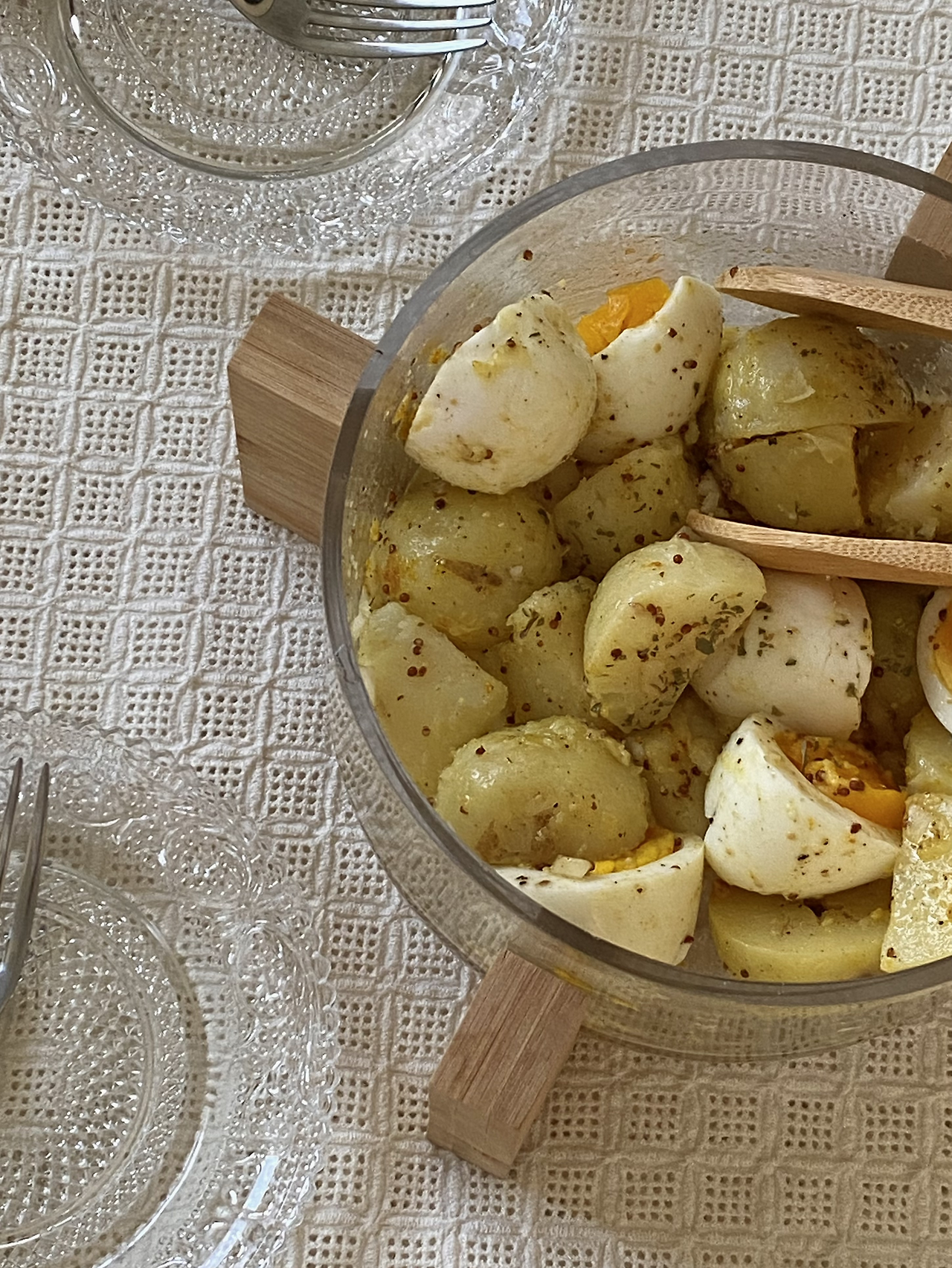 본 레시피에는 껍질 벗긴 감자를 강황 가루 1/2작은술과 소금 1작은술을 넣고 삶는다고 되어있다. 우리 집엔 냉동해둔 찐 알감자가 있었기 때문에 노선을 바꿨다. 전자레인지로 감자를 해동하고 달걀을 삶았다. 달걀을 삶을 땐 ‘꼬꼬찜기’를 사용한다. 이름처럼 귀여운 꼬꼬 모양의 찜기인데 물을 끓일 필요도, 콘센트조차 필요 없으며 단시간에 완성된다. 삼성 페이급 간편함이다(본인 아이폰 유저). 강력 추천을 넘어 강매하고 싶다. 찜기에 물 조금 넣고 전자레인지 6분이면 반숙, 8분이면 완숙이 된다. 익힌 감자와 달걀을 반으로 잘라 볼에 넣고 드레싱을 2큰술 뿌린다. 강황 푼 물에 삶는 과정을 생략했으므로 직접 강황 가루 조금을 뿌리고 뒤섞어 줬다. 그 위에 파슬리를 뿌리고 통후추를 갈아 올린다. 마지막 화룡점정, 트뤼프 오일 2작은술을 뿌려 주면 된다.