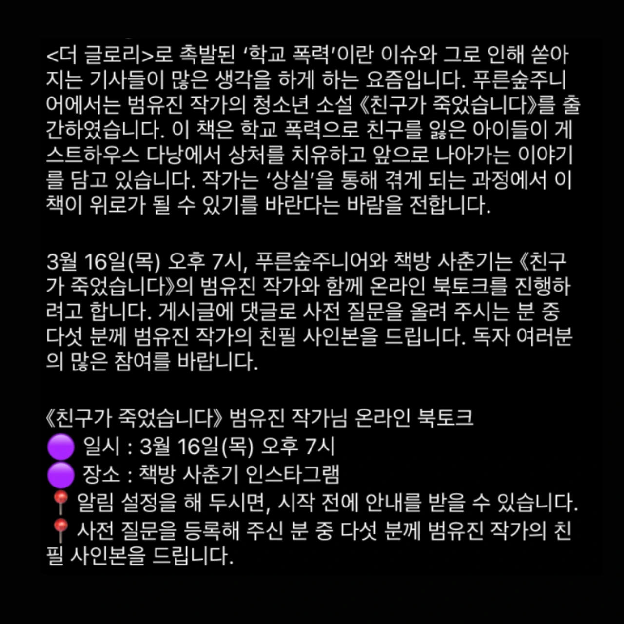 3월 16일 목요일. 저녁 7시 책방 사춘기 인스타그램에서 만나요