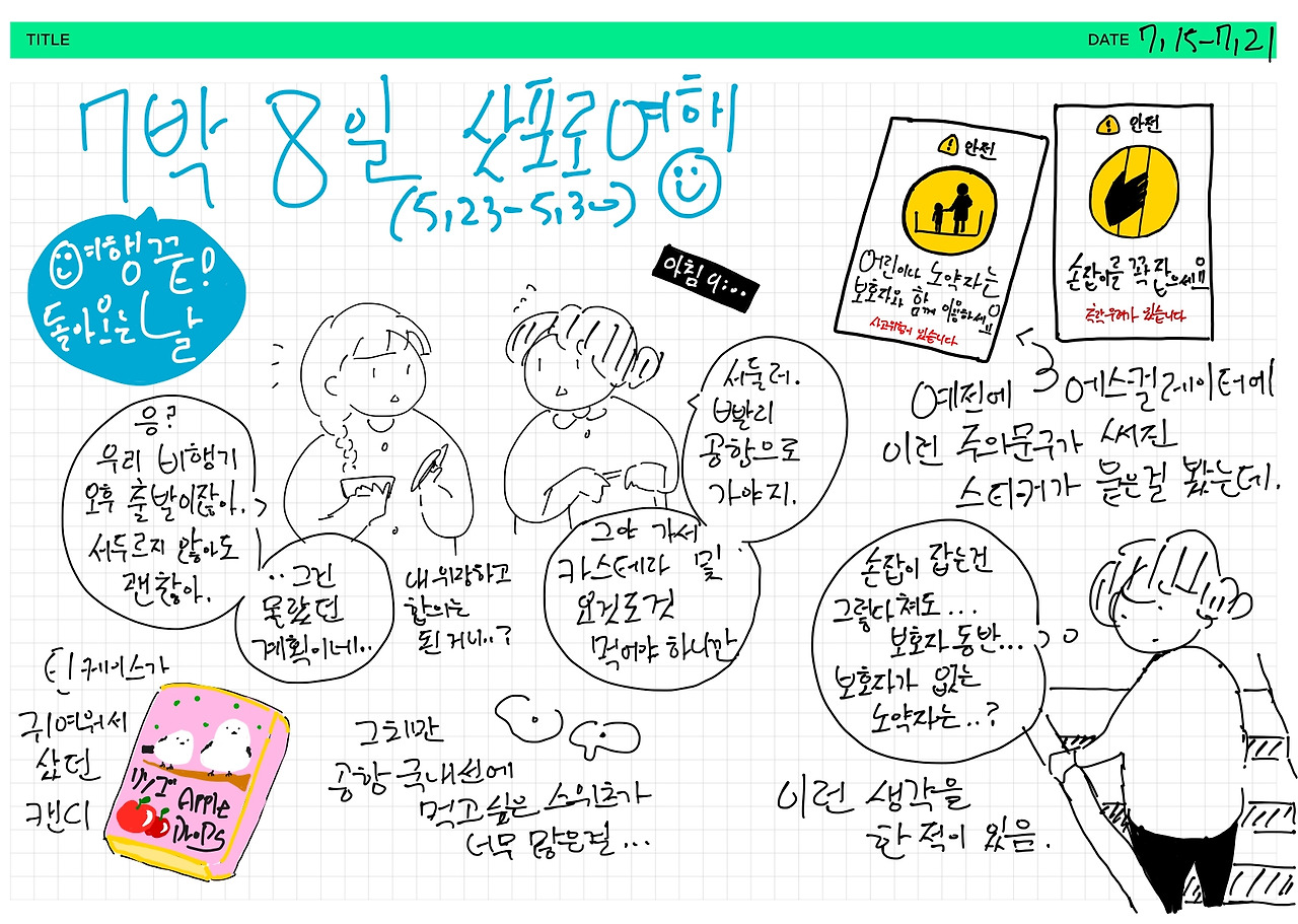 여행 마지막 날. 출국 수속을 밟기 위해 공항으로 향하던 길이었습니다. 지하철에서 공항으로 이어지는 에스컬레이터에 타려고 했지요. 에스컬레이터에 이미 네 명이 올라타 있던지라 조금 텀을 두려고 아래에 서 있었습니다. 저 사람들이 내리면 타야지, 싶어 시선은 에스컬레이터에 고정한 채 말입니다.