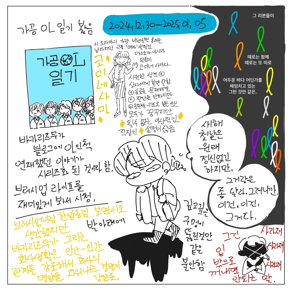 2024년에서 2025년으로 뒤의 숫자가 바뀌는 것 뿐인데 왜 무언가를 마무리하고 넘어가야 할 것 같은 조바심이 드는 걸까요. 이것저것, 밀린 일을 들추어 보아도 소용 없다는 걸 압니다. 해의 마지막 하루만에 정리할 수 있는 일이었다면 진즉에 끝났겠지요. 애초에 일이란 건, 이외로 나 혼자 힘낸다고 마무리 되지 않는 게 더 많기도 합니다. 그럼에도 매년 연말이면 초조함을 느끼고, 며칠간 허둥거리다가 쓸데없이 피곤해져서는 새해 첫 날을 맞이하게 되지요.