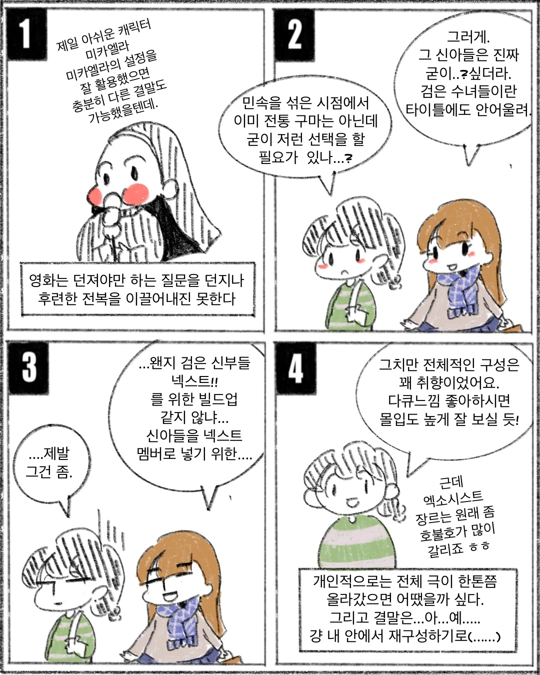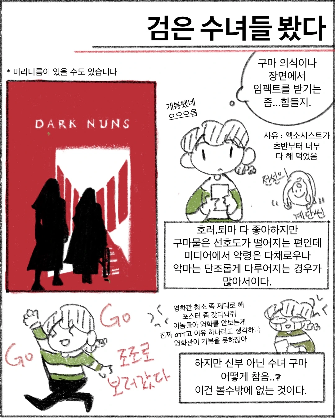 <검은 수녀들>은 그런 면에서, 미카엘라 캐릭터의 활용이 무척 아쉬웠습니다. 귀태라는 걸 그토록 강조했으면서도 그 설정을 통해 이야기를 전혀 풀어나가지 않았죠. 영화 타이틀이 <검은 수녀들>인 만큼, 구마 과정에서 왜 굳이 신아들이 참여했어야 했는지도 의문입니다. 신을 받은 자가 필요하다는 부분 때문이라면, 귀태인 미카엘라와 이미 무당이 된 전직 수녀가 힘을 합치면 더 멋진 반전을 만들어 낼 가능성이 충분히 있었는데 말입니다.