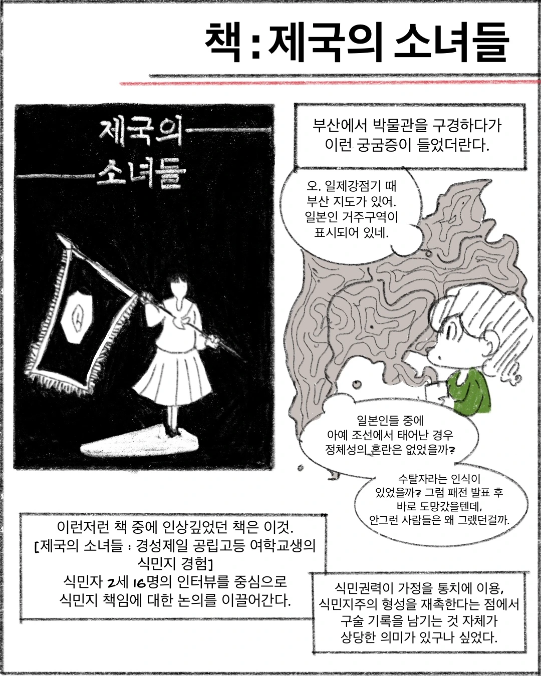 1) 책의 인포먼트인 식민자 2세들은 광복 당시 경성고등여학교 재학 중으로 1920년 중후반 출생입니다. 만세운동을 풍문으로만 듣거나 아예 모르는 사람이 다수. 교류가 있던 몇 안 되는 조선사람은 대부분 창씨 개명을 한 상태였다고 합니다.