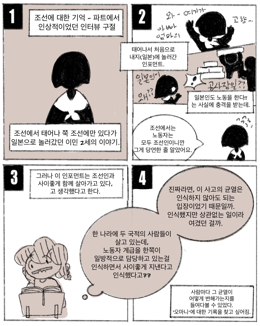 2) 이 책은 구술 취재하는 점에서 큰 의미를 가집니다. 하지만 개개인 인포먼트의 진술을 어디까지 신뢰할 수 있는가, 하는 점에서 한계를 가진다고 볼 수도 있습니다. 때문에 단편적인 진술보다는 인포먼트별로 진술을 엮어 나가며 읽는 쪽을 권합니다. 그 편이 식민자로 있을 때와 인양자로서 일본에 돌아가 차별의 대상이 되었을 때, 어떠한 인식의 변화가 일어나는지 잘 살펴볼 수 있습니다.