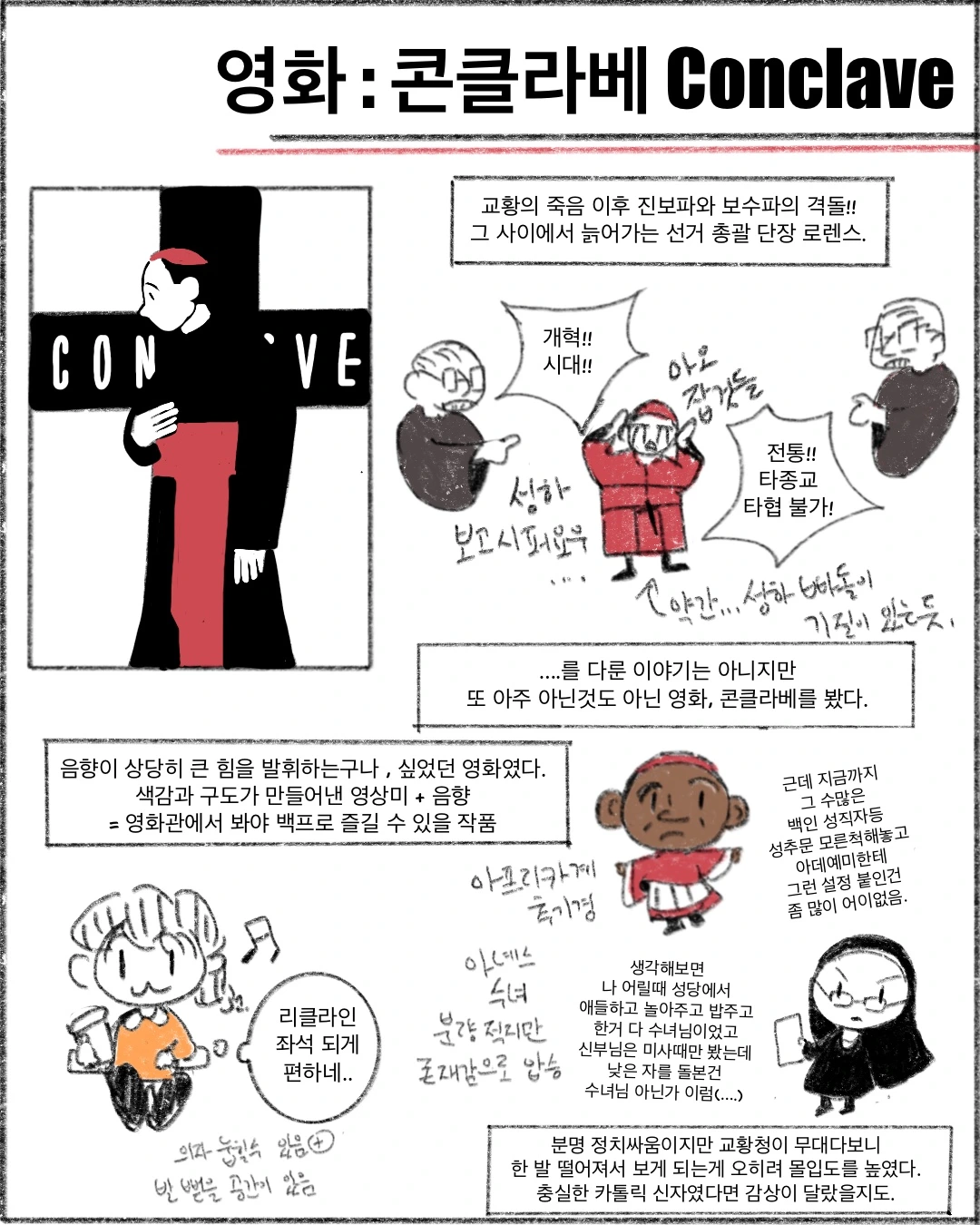 1) 콘클라베는 교황 선종시 선거권을 가진 추기경단이 소집되어 교황을 선출하는 비밀 회의를 뜻하며 '열쇠로 문을 잠근 방'을 의미한다고 합니다. 옛날에는 빠른 결정을 위해 날이 지날수록 식사량을 줄여 제공하는 방법도 썼다고 하네요. 11세기 초까지는 평신도에게도 교황 선출권이 있었으나 그로 인한 부작용이 커서 1059년에 추기경에 한한 투표로 바뀌었다고 합니다.