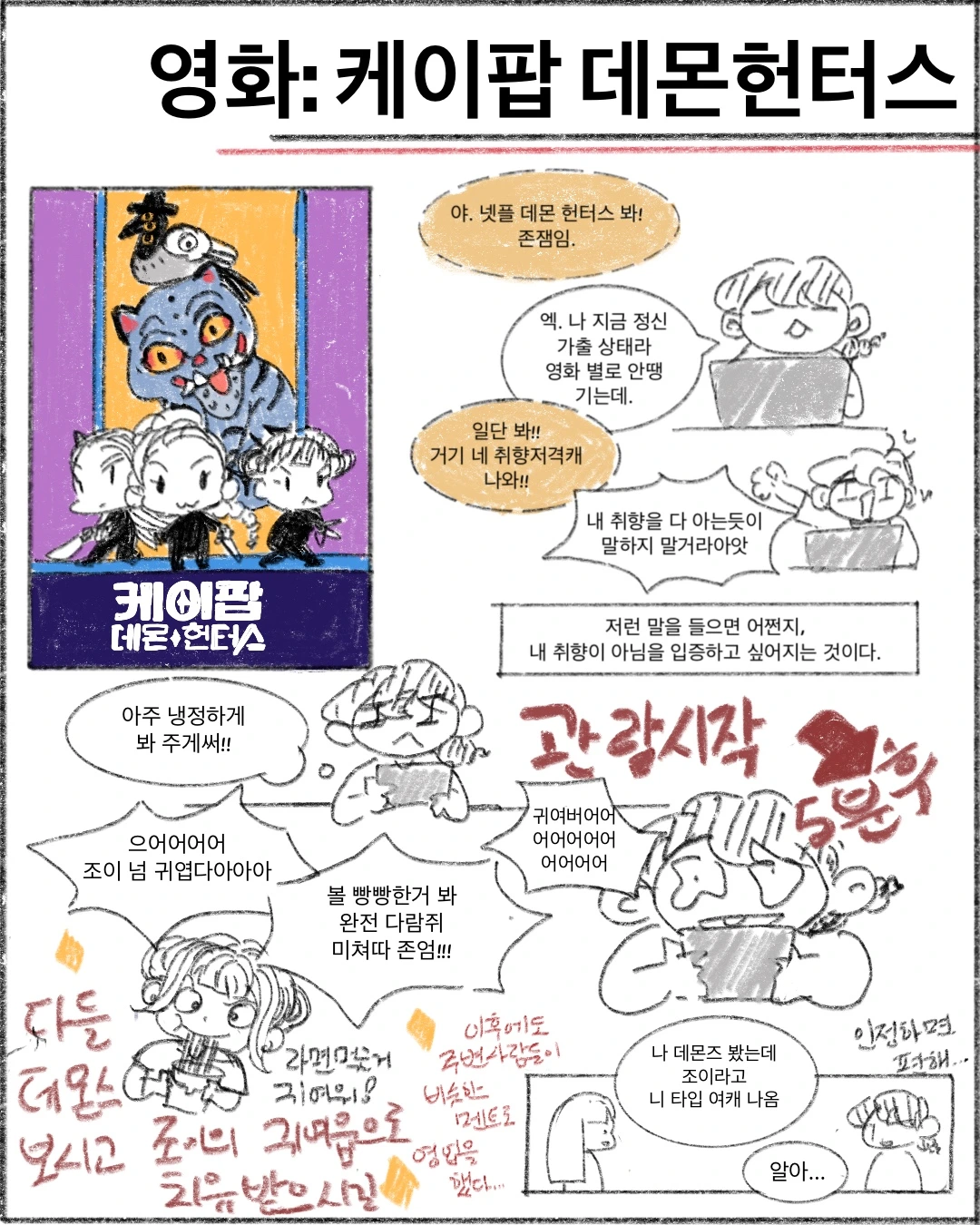 내용만 놓고 보자면 케이팝에 바라는 것들을 스토리로 잘 풀었구나 싶었어요. 비주류라고 해서 주변에 맞추지 말고 진정한 너를 찾아내 + 가족을 대신하는 절대적인 지지자 + 유사연애 = 아주 맛있는 짬뽕. 바깥에서 바라본 케이팝이기에 오히려 긍정적인 요소만을 잘 건져올렸지 싶습니다. 내부에서 바라보면 너무 많은 게 보여서 오히려 단순화된 스토리를 만들어내는게 더 힘들 때도 있지요.