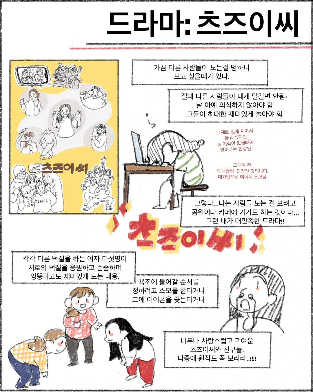 2. 츠즈이 씨 친구들을 봐도 덕질의 형태는 제각각입니다. 간혹 자기가 하는 덕질이 최고라거나, 그 외의 덕질 방법은 인정하지 않다거나 하는 사람들을 만날 때가 있어요. 예를 들어 책은 낙서를하거나 손상해서는 안 되고 책을 찢는 사람은 이해할 수 없다거나. 혼자서 그렇게 생각하는 건 상관없지만 그걸 타인을 판단하는 잣대로 사용하는 순간 폭력이 됨을 명심합시다. 존중받고 싶으면 먼저 존중합시다.