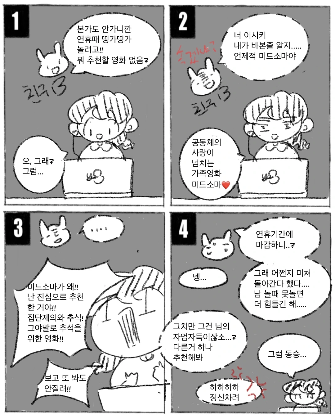 친구는 저와 미드소마와 동승을 모두 함께 봤답니다. 영화관에서. 저는 둘다 호(好)였고 친구는 불호(不好)였어요. 극명하게 갈리는 영화 취향. 고로 미드소마다 추석에 보기 좋은 영화라고 추천한 건 진심이었답니다. 화면이 예뻐서 봐도봐도 안질림. 장화홍련이나 경성학교도 작업용 영화로 선호합니다. 머리 쓸 때는 화면 예쁜게 최고임.