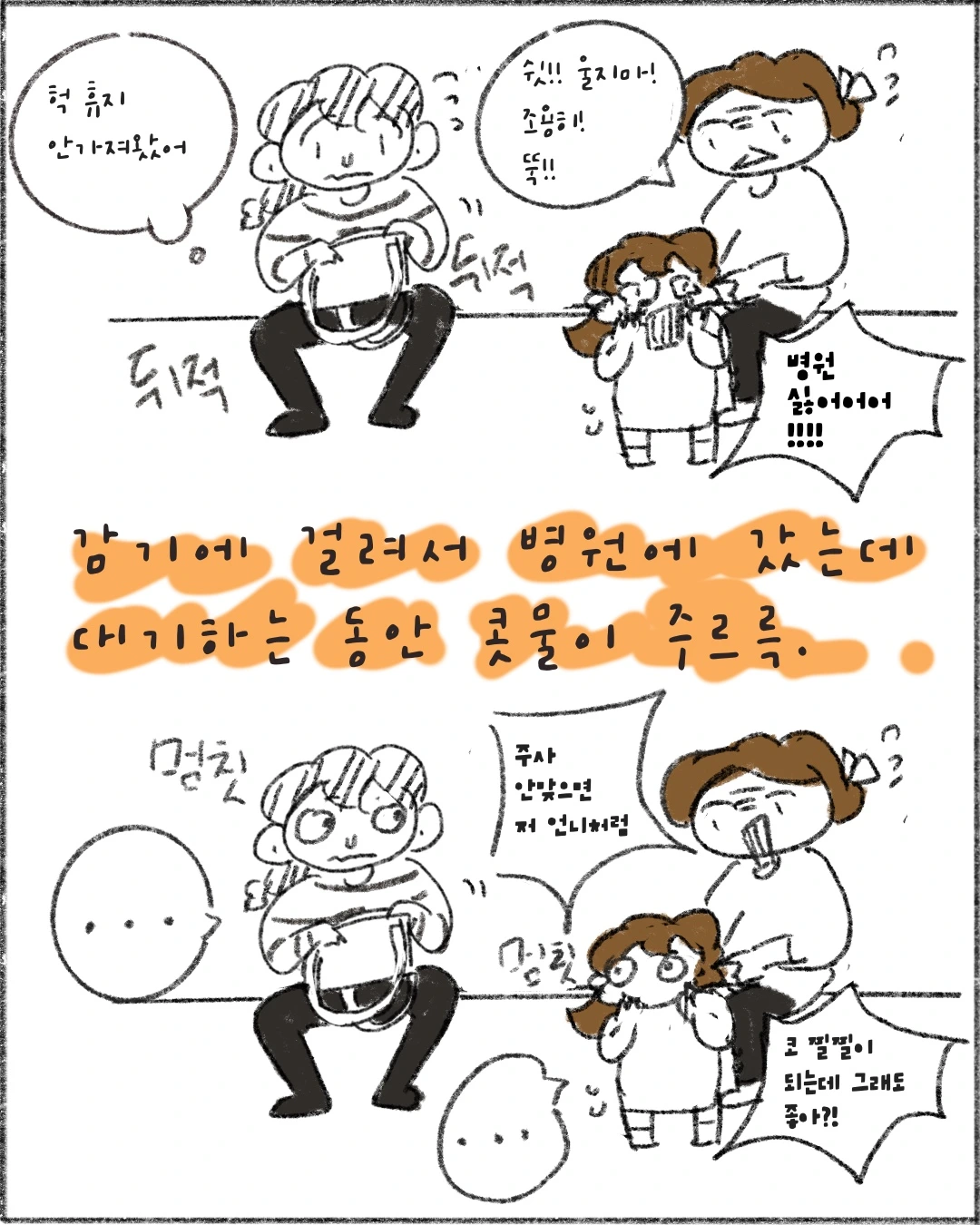그리고 전 원래 병원에서 애들이 우는 걸 크게 신경쓰지 않습니다. 어른인 나도 약 싫고 주사 싫은데 니네는 오죽하겠니....이런 기분.