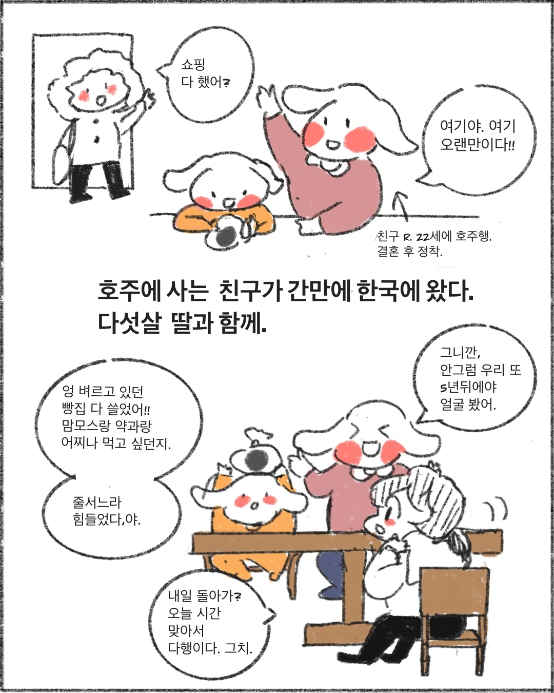 1. 친구는 5,6년에 한번씩 한국에 옵니다. 이 우정이 지속되고 있는 건 둘 다 무소식이 희소식, 안 만나도 크게 상관은 없다 - 라는 성향이 맞아서 그런 게 아닐까 싶습니다. 친구는 어떻게 자기처럼 무덤덤한 엄마에게서 말랑말랑한 딸이 나왔는지 의아해하는데, 제가 보기엔 엄마로서의 친구는 상당히 말랑말랑합니다. 말랑말랑.