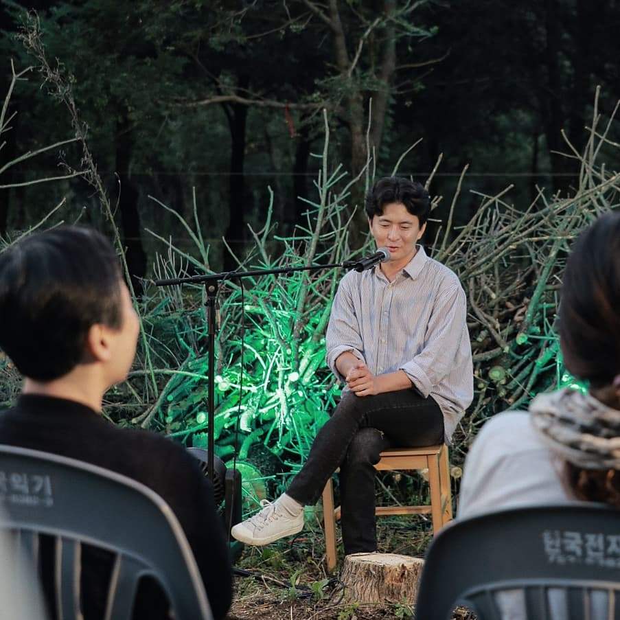 도착했다. 숲 속에 약 50좌석 정도 되는 작은 규모의 콘서트. 사람들도 그곳에 난 풀처럼 듬성듬성 있었다. 그리고 자리를 잡아 앉아 두리번 두리번 거리는데 내 눈에 그사람이 보였다. 김동영 작가가. 에코백에서 무언가를 뒤적뒤적 하면서.