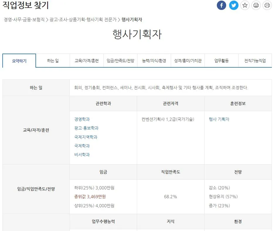 워크넷(worknet)에 들어가 보면 한국직업정보라고 있다. 대-중-소 3단계로 분류되어 있는데 예를 들어 행사기획자라는 직업은 "경영,사무,금융,보험직"(대)-"경영,행정,사무직"(중)-"행사기획자"(소)로 분류된다. 그리고 해당 직업에 대한 다양한 정보가 정리되어 있다.(하는일,자격,임금,전망,필요적성 등=>아래 이미지 참고) 끝.