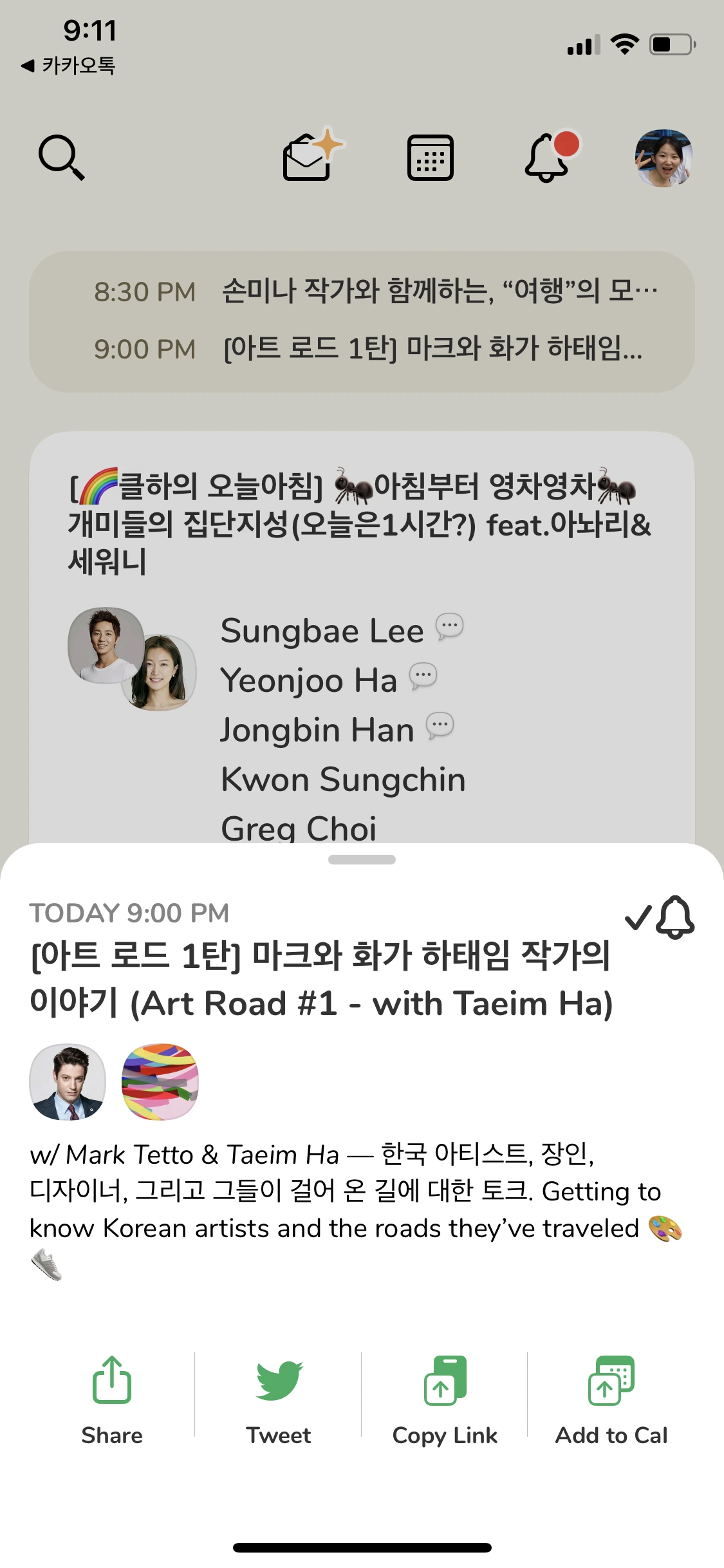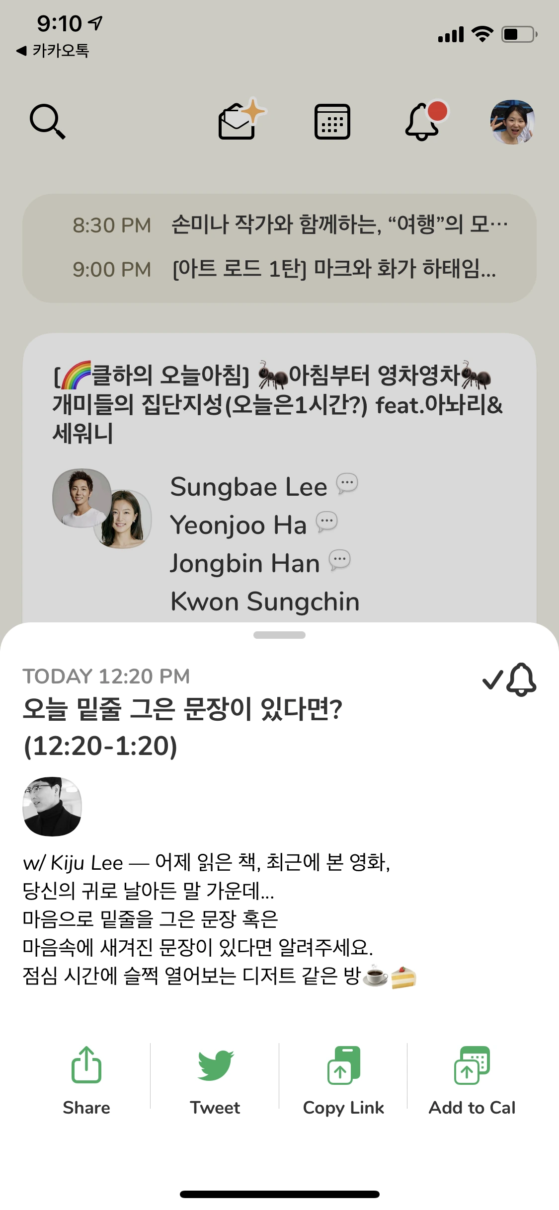 4. 팔로우하는 사람이 어떤 방을 개설하면 그 방에 대한 추천 알림이 와서 좋았다. 원래 안승준이라는 분을 몰랐는데, 손미나 작가와 함께 방에서 모더레이터 역할을 해서 관심이 생겼고, 그의 이야기를 더 듣고 싶은 생각에 몇 번 그를 따라 다른 방에 가본 적이 있다.