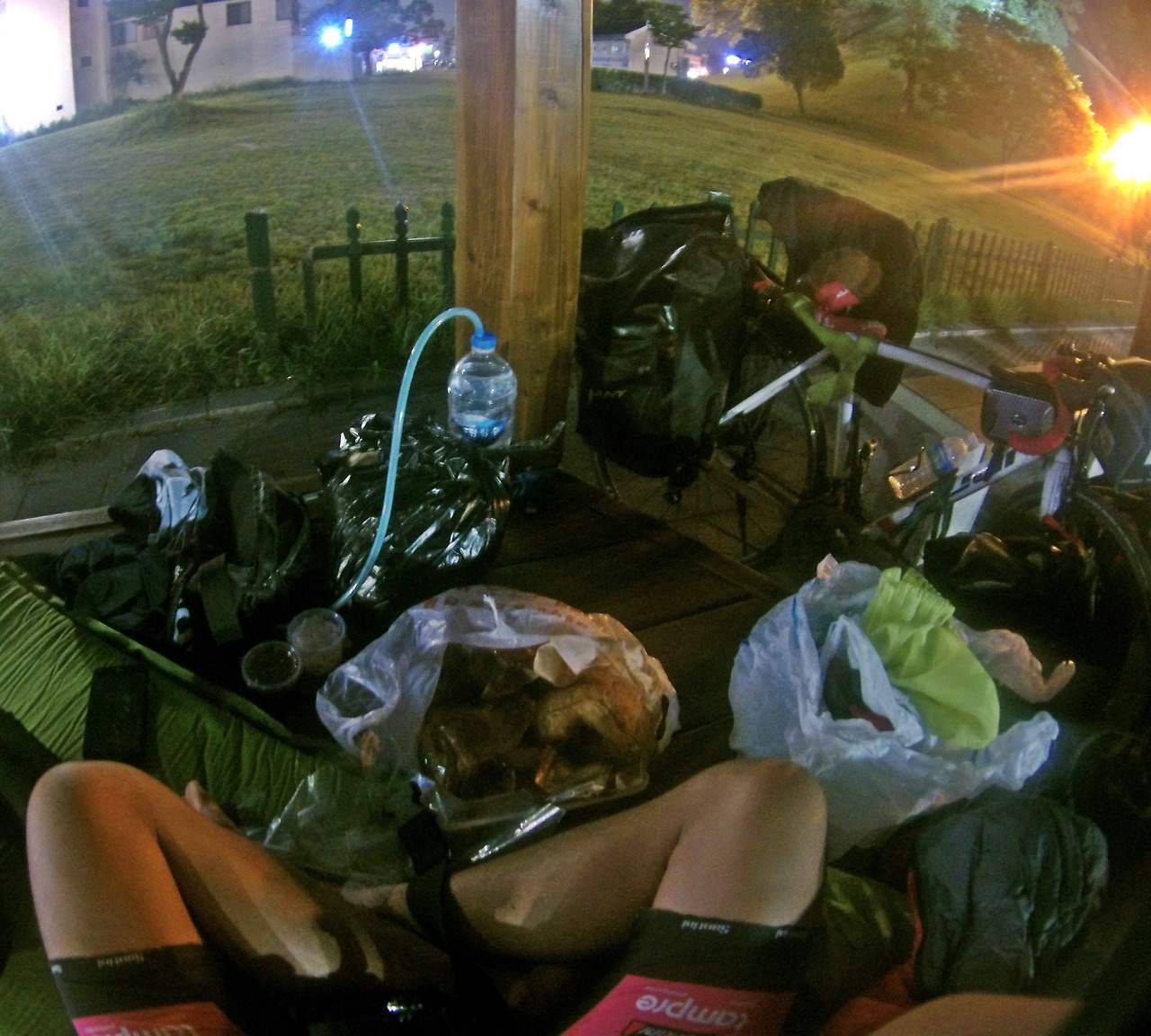 밤이 되어 어둑해진 시내에 도착했는데, 어느 순간 옛날통닭집 앞에서 침을 질질 흘리고 있는 내 모습이 유리에 반사되어 비쳤다. 이 날 이상하게도 식비 지출이 거의 없었기에 예산 안에서 보양식 한 번은 먹을 수 있겠다 싶어서 옛날통닭을 포장하고 편의점에서 사포로 맥주 한 캔을 구입했다. 이제 앉아서 먹을만한 곳을 물색하기 시작했다. 시내 주변을 돌아다니다 보니 공원같이 조성된 곳에 정자와 벤치가 있었다. 그곳을 발견하자마자 브레이크를 꽉 붙잡고 멈춰 서서 정자에 짐을 풀어놓고 통닭을 먹기 시작했다. 잠시 후, 기름 묻은 손으로 휴대폰을 만지작거리며 시답잖은 동영상들에 시시덕거리며 닭을 뜯고 있을 때, 정자 주변에서 진행되던 한 행사가 끝났는지 사람들이 해산하여 정자 옆을 지나가는 게 보였다. 그런데 이상하게도 사람들은 나를 굉장히 불쾌한 눈으로 보고 지나갔다.