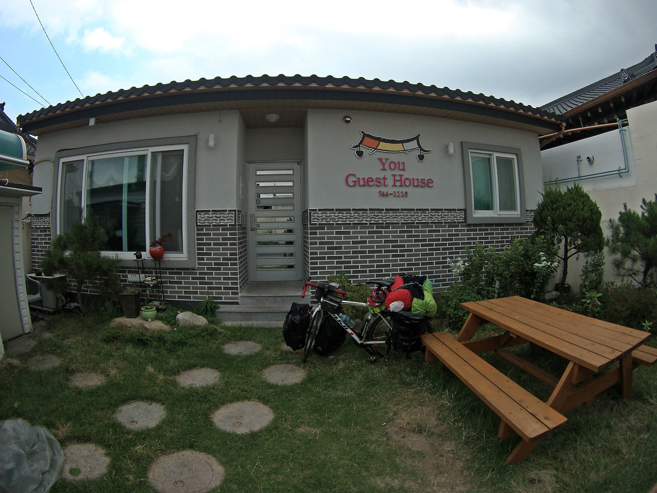 잠을 청했던 게스트하우스와 맥주를 마셨던 테이블, 그리고 내 자전거가 보인다.