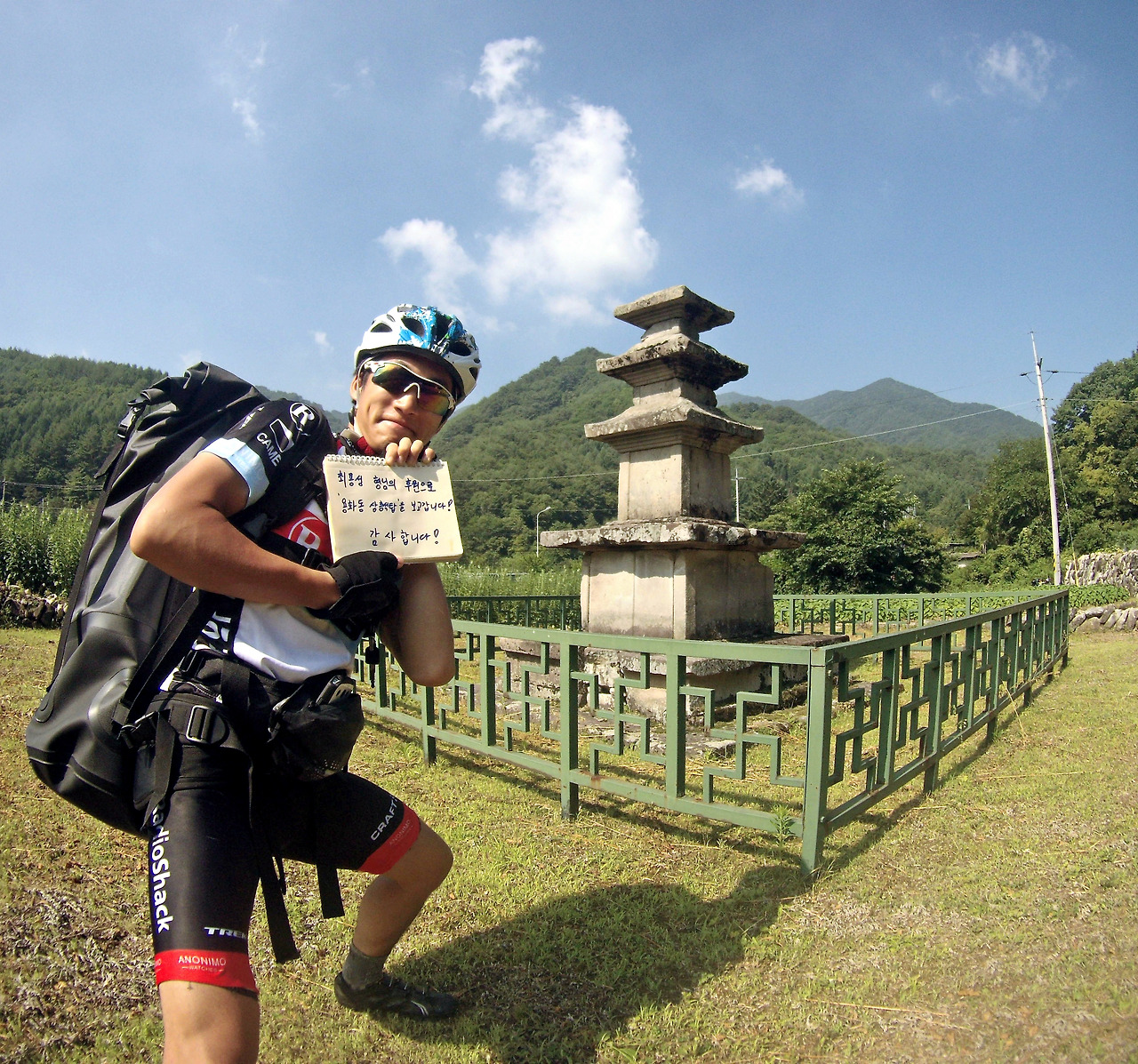"안녕하세요. 자전거 여행 중인 사람입니다. 정상까지 전력 질주해서 갔다 올 건데 잠시 자전거(국보 제494786호)를 맡아주실 수 있으실까요?"