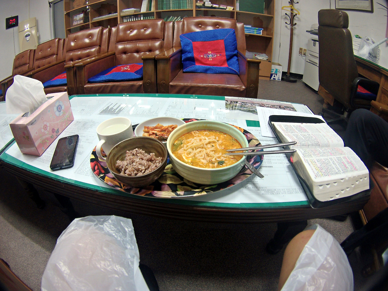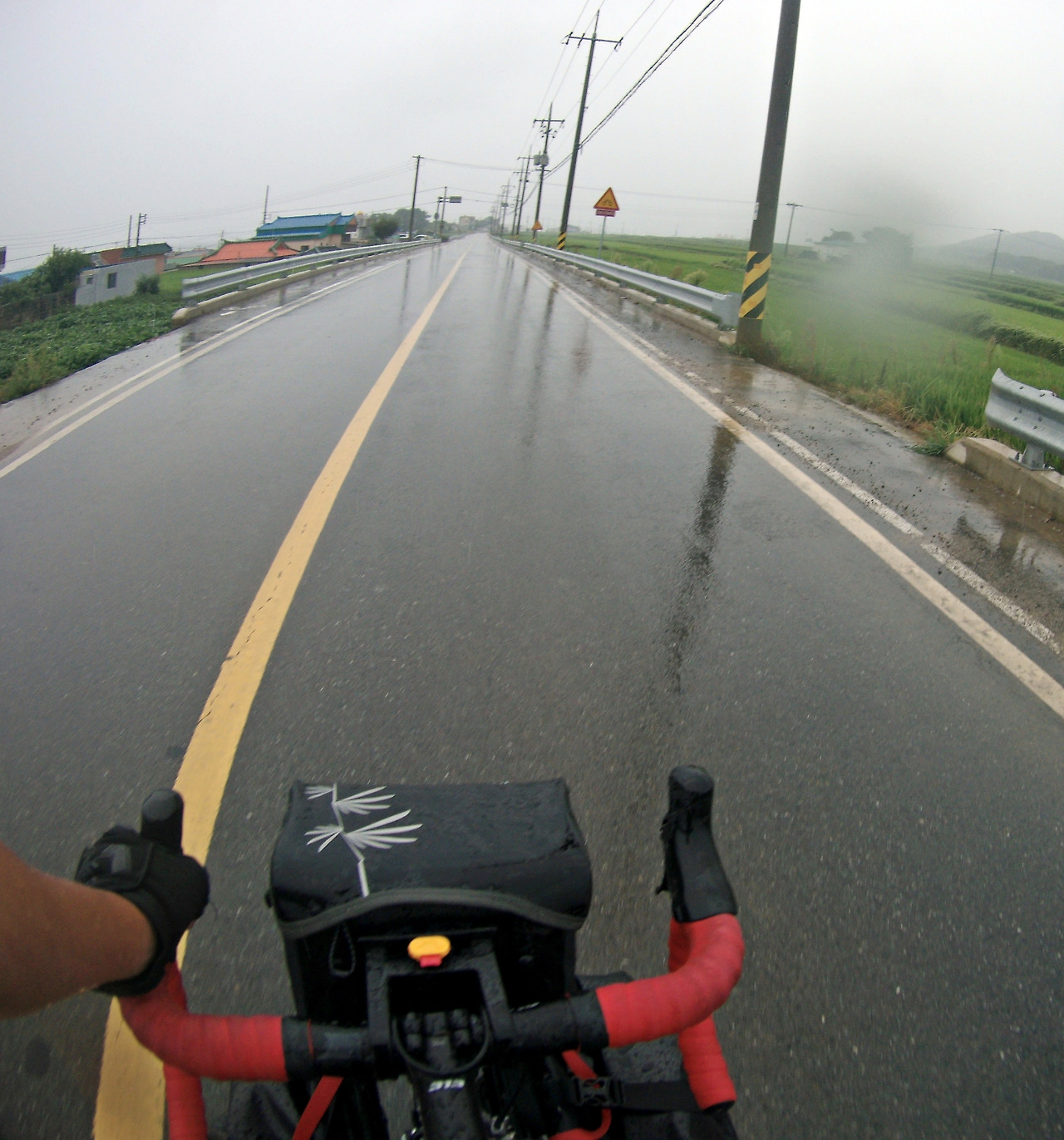 다음날, 비가 왔지만 하루 더 묵는 건 너무 민폐인 것 같아서 인사를 드리고 교회를 떠나 곧장 빗길을 달렸다. 등산만 아니라면 뭐던 환영이었다. 빗길을 달리는 길에 마트를 계속해서 지나쳤는데 전 날까지만 해도 구멍가게 하나 찾으려고 기를 쓰고 다녔던 모습이 떠올라 웃음이 나왔다. 오후가 되니 하늘이 온통 먹 섞인 비구름으로 뒤덮이고 장대비가 총알처럼 떨어지기 시작했다. 마치 전쟁이라도 난 듯이 말이다. 체온이 떨어져서 입술이 퍼레진 상태로 비를 맞고 달리는데 체온이 급격히 떨어졌다. 우비를 입긴 했지만 일회용이라 비가 다 셌다. 옷을 말리고 체온을 유지할 수 있는 안식처를 찾아야 했는데 그러지 못했다. 비를 맞으며 멍청히 서있을 순 없으니 대피할만한 정자나 건물이 나올 때까진 계속 달려야 했다. 바람은 심했고 차량들은 쌩쌩 내달리며 물을 튀기고 지나갔다. 해는 어느새 칠흑같이 어두워졌고 땅거미가 내려앉을 무렵, 저 멀리 십자가가 시야에 들어왔다. 그 순간 염치없게도 따스한 주님의 은총을 또 한 번 기대하며 이틀째 교회 숙박을 소망한 채로 십자가를 향해 달렸고, 하수구 생쥐처럼 쫄딱 젖은 채로 교회에 도착해서 사무실처럼 보이는 곳을 똑똑 두들기고 들어갔다. 그곳엔 목사님이 앉아계셨다. 그리고 조금 놀라신 것 같았다. 목사님은 인사를 하시더니 저녁예배시간에 설교할 내용을 한 번 더 살펴보고 계시던 참이었다고 하셨다. 차근차근 지금까지 있었던 일들과 현재 사정을 말씀드렸는데 감사히도 목사님께서 하룻밤 자고 가라고 흔쾌히 허락해주셨다. 사모님은 이렇게 추운데 자전거를 타고 밖을 돌아다니냐고 하시며 곧바로 따뜻한 라면 한 그릇을 끓여와 주셨다. 호로록 먹는데 온몸이 녹아내렸다. 입에선 방언이 터져 나왔다. 그렇게 맛있는 라면은 세상에서 처음 먹어보는 듯했다. 사모님께선 분명 라면계의 바흐이심이 분명했다.
