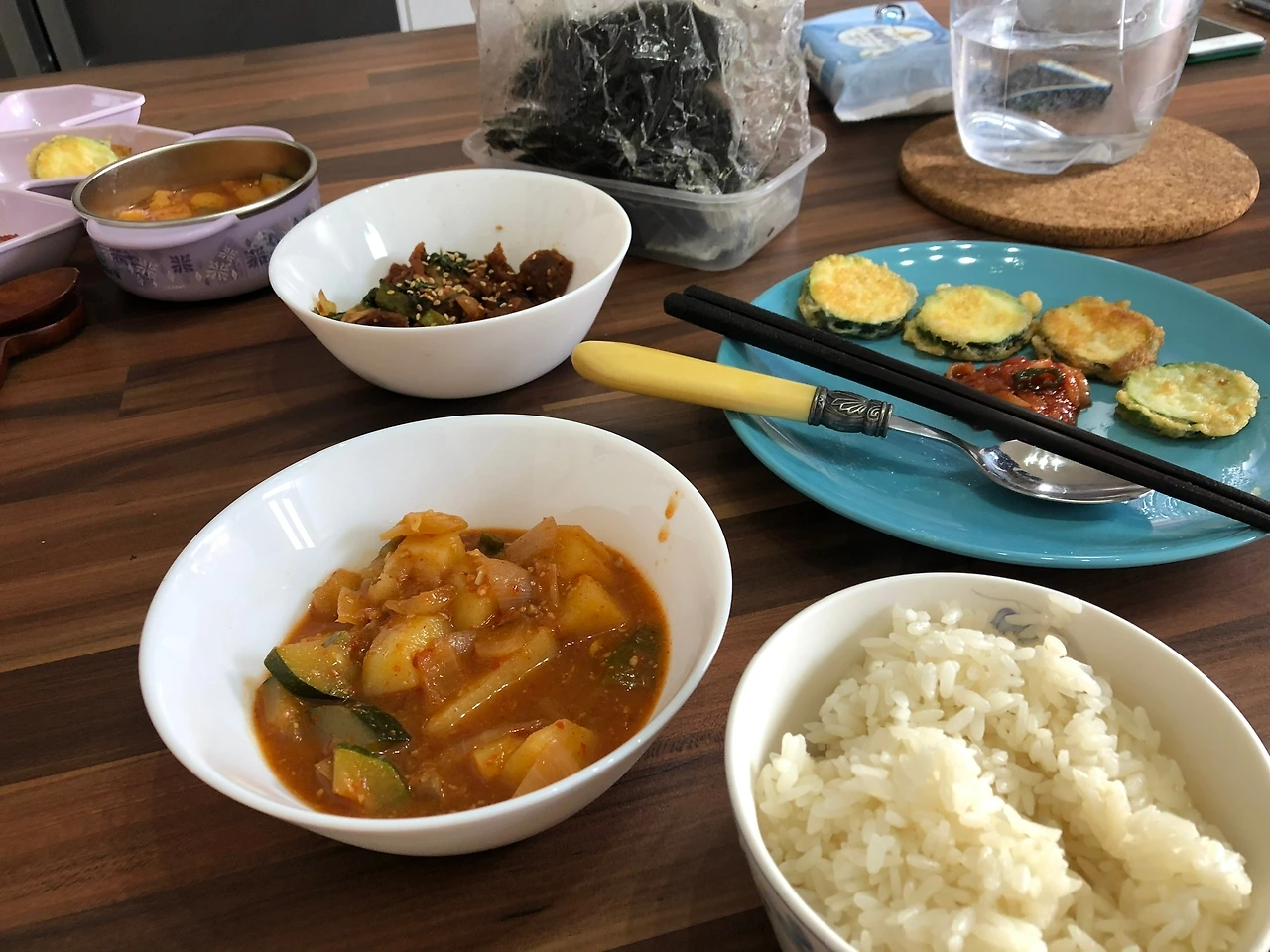 머리에 물기를 털며 나오니 친구가 늦은 점심을 먹자며 식탁에 나를 앉혔다